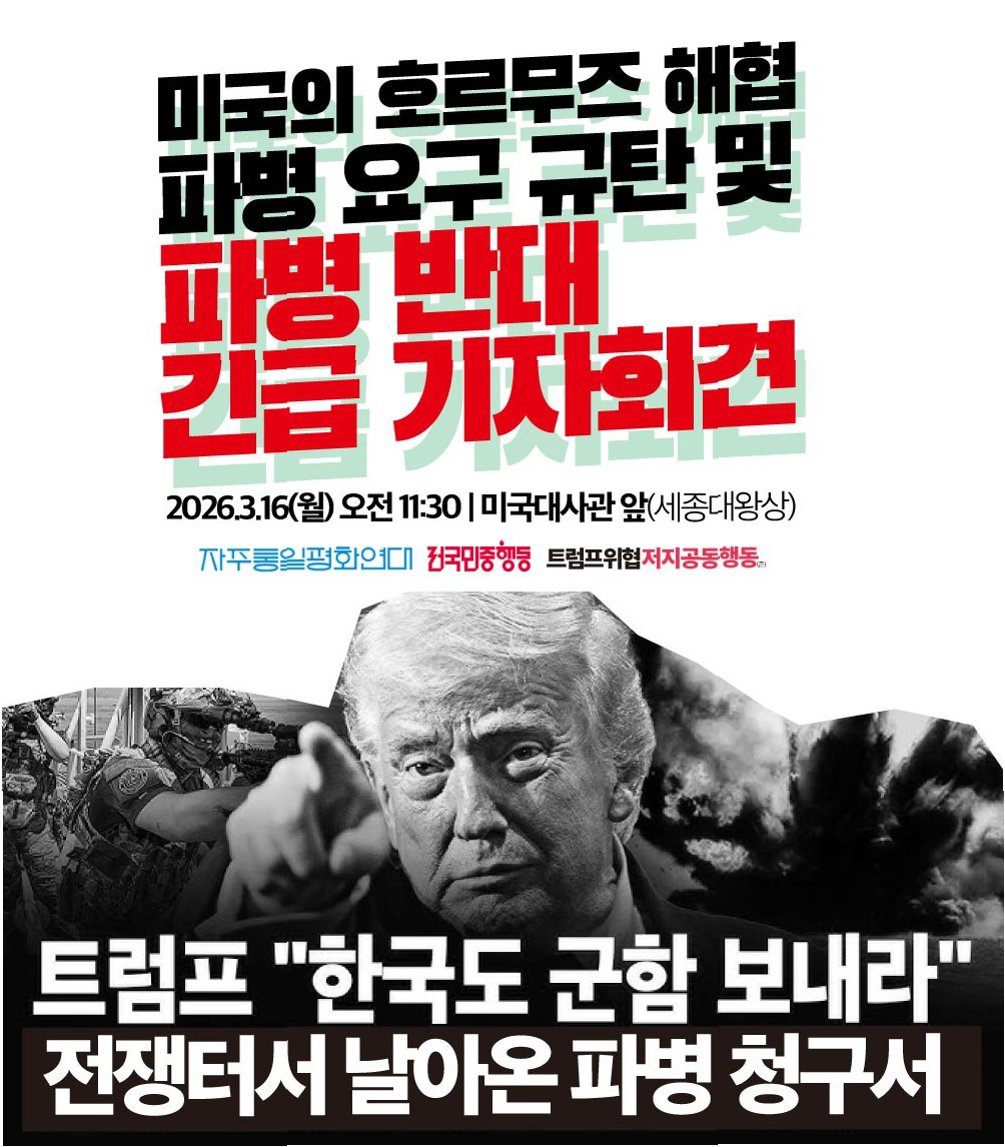 평화행동, 광화문서 호르무즈 파병 반대 집회 개최시민사회단체 '침략전쟁규탄파병반대평화행동'은 주말 오후 서울 광화문 KT 빌딩 앞에서 호르무즈 해협 파병 요구에 반대하는 집회를 열었습니다. 100여 명의 참가자들은 '침략 전쟁'으로 규정된 이란과의 전쟁에 한국 정부가 협력해서는 안 된다고 주장하며, 파병 요구 거부를 촉구했습니다. 이들은 미국과 이스라엘의 이란 침략을 즉각 중단할 것을 요구하며 평화적인 해결을 강조했습니다. 참가자들, '침략 전쟁' 규정하며 정부에 협력 거부 촉구집회 참가자들은 '침략을 멈춰라 전쟁을 멈춰라', '정부는 파병 요구 거부하라' 등의 피켓을 들고 목소리를 높였습니다. 사회자는 미국의 이란 침략 전쟁이 한 달째 이어지고 있으며, 이는 명분 없는 침략이라고 규정했습니다. 참..