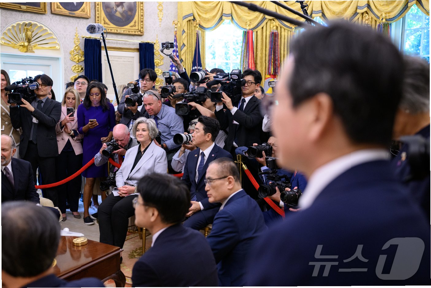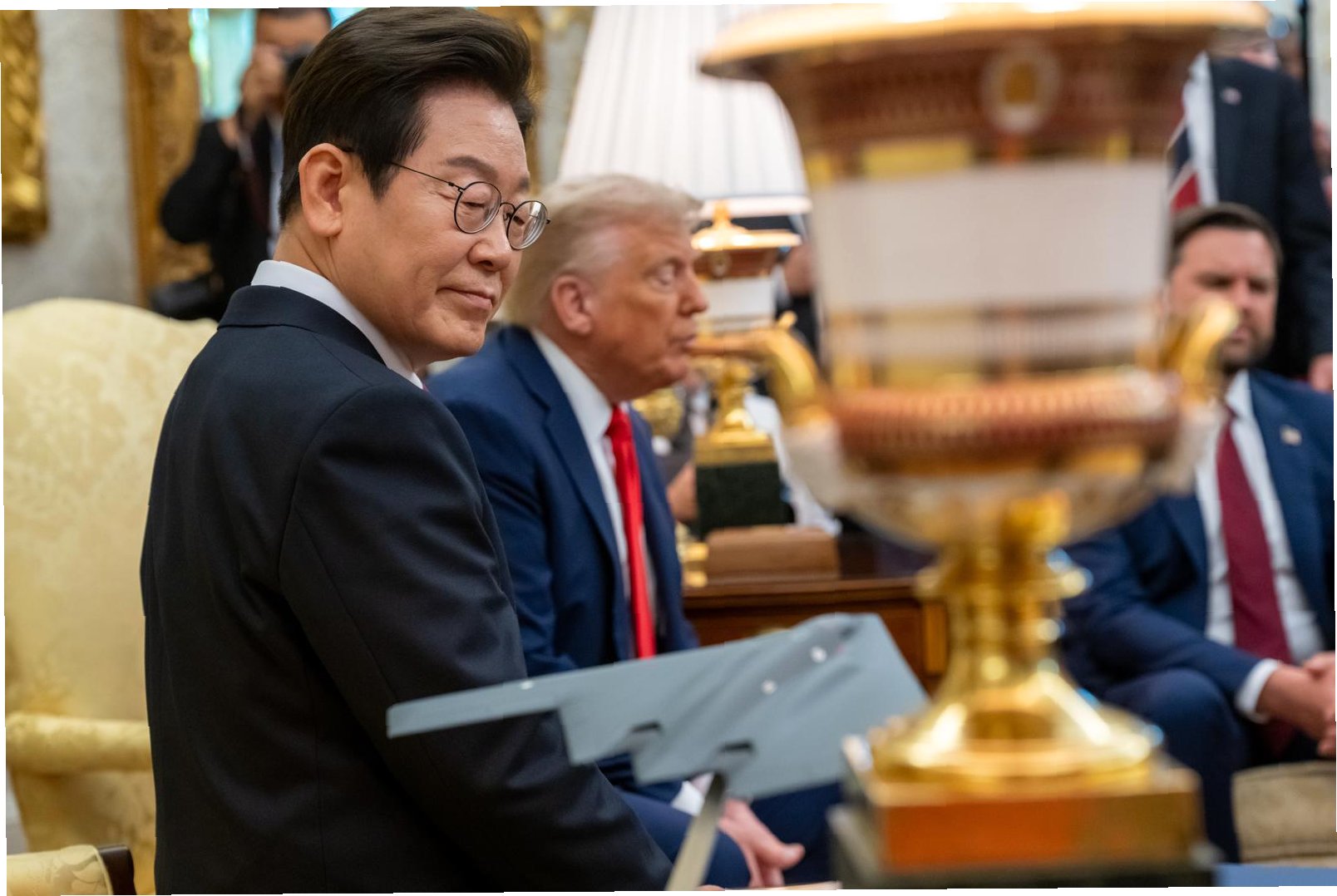 가장 눈길을 끄는 장면 중 하나는 이재명 대통령이 트럼프 전 대통령의 집무실인 오벌오피스의 '결단의 책상'에 손을 짚고, 트럼프 전 대통령에게 적극적으로 무언가를 설명하거나 설득하는 듯한 모습입니다. 트럼프 전 대통령은 상징적인 '결단의 책상'에 앉아 있고, 이재명 대통령은 그 앞에서 몸을 앞으로 기울인 채 진지하게 대화를 나누는 모습은 두 정상 간의 깊이 있는 대화를 짐작하게 합니다. 강훈식 비서실장과 통역의 모습도 함께 포착되어, 실시간으로 이루어진 소통 과정을 엿볼 수 있습니다.