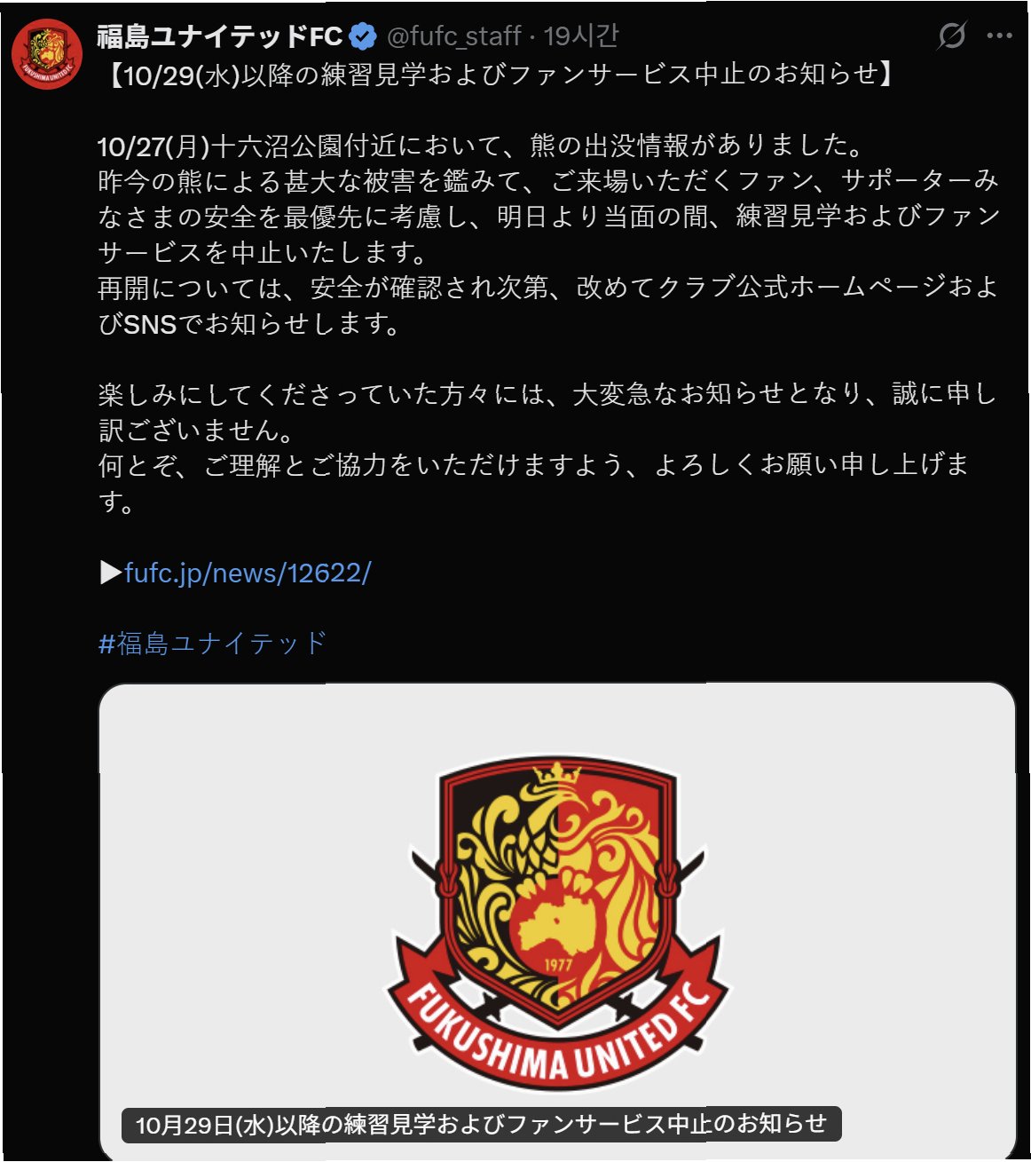 A.네, J3 구단 후쿠시마 유나이티드도 곰 출몰로 인해 팀 공개 훈련을 잠정적으로 중단했습니다.