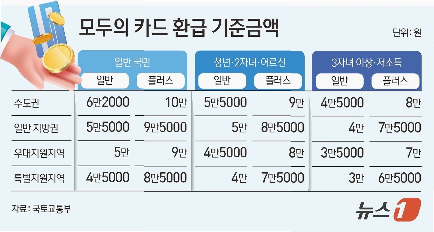 '모두의 카드'는 회당 평균 이용 금액 3,000원을 기준으로 별도 신청 없이 '일반형'과 '플러스형'이 자동 적용됩니다. 일반형은 수도권에서 월 교통비 지출액이 6만 2,000원을 넘으면 초과 금액 전액을 환급하며, 플러스형은 10만 원까지만 본인 부담 후 초과 금액을 환급합니다. 청년, 2자녀, 어르신은 각각 5만 5,000원, 9만 원으로 상한선이 낮아지며, 3자녀 이상 또는 저소득층은 4만 5,000원, 8만 원으로 더욱 혜택을 받을 수 있습니다. 예를 들어, GTX를 이용하는 대학생 A씨는 월 교통비 약 15만 원에서 6만 원을 돌려받을 수 있습니다.