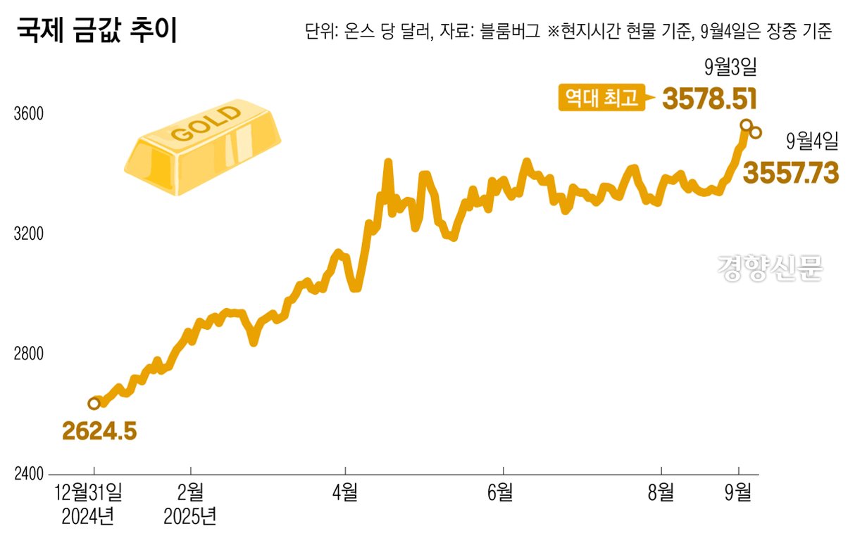 국제 금값이 온스당 3600달러를 돌파하며 또다시 사상 최고치를 경신했습니다. 8일(현지시간) 뉴욕상품거래소(COMEX)에서 금 현물 가격은 한때 온스당 3646.46달러에 거래되었습니다. 9일 아시아 시장에서도 3635.07달러에 거래되며 고공 행진을 이어갔습니다. 불과 엿새 만에 3500달러 선을 넘어선 금값의 상승세는 가히 놀랍습니다.