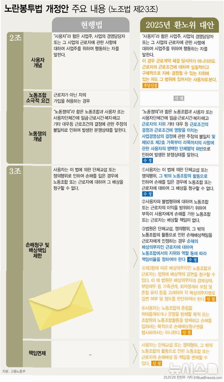 이날 통과된 노란봉투법은 노조법 2·3조 개정안은 크게 사용자와 노동쟁의의 개념 등을 규정한 2조와 노조 활동과 관련한 손해배상 청구 및 배상 책임을 다룬 3조로 나눠집니다. 이를통해 하청업체 등 간접고용 근로자도 원청 사용자와 단체교섭 등을 할 수 있도록 해 노동권을 보장하고, 특수형태근로종사자(특고)·플랫폼 종사자 등의 단결권을 보장합니다. 또한 ‘노동쟁의 개념’을 기존 ‘근로조건의 결정’에서 ‘근로조건의 결정과 근로조건에 영향을 미치는 사업 경영상의 결정’으로 수정했습니다.