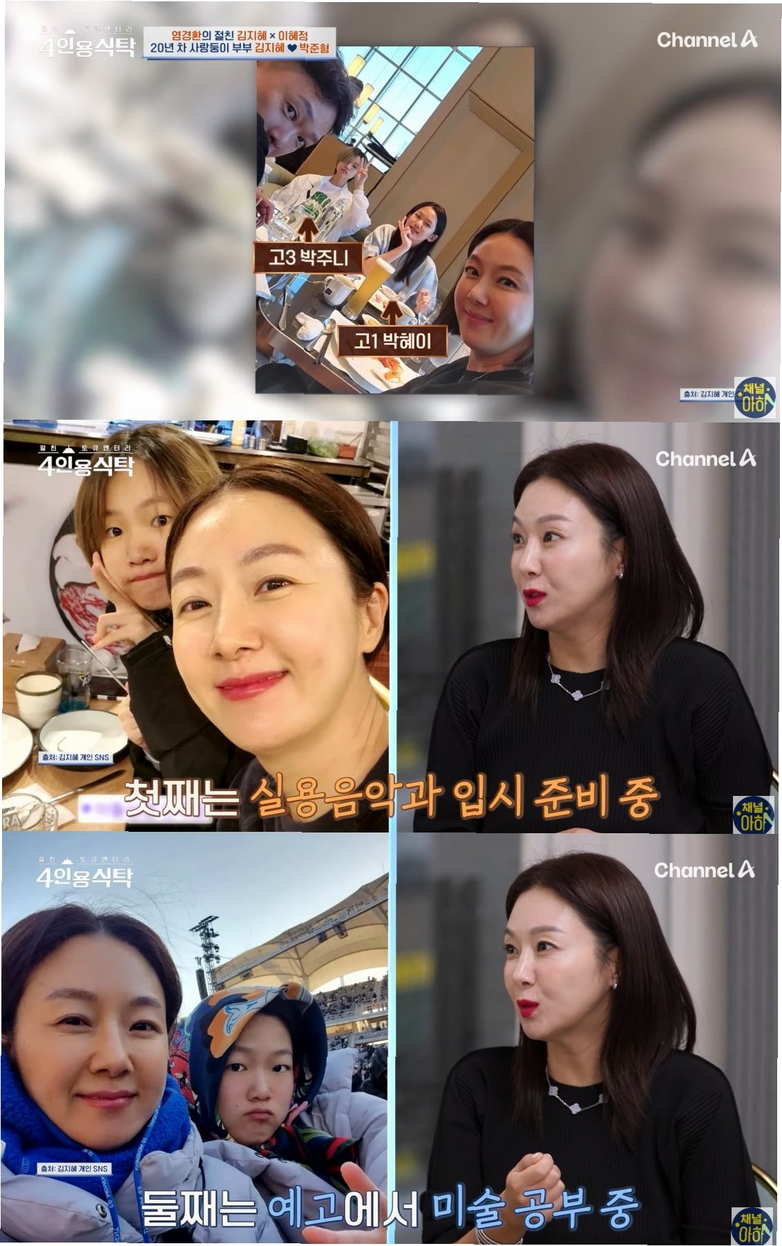 김지혜는 지난 10일 방송된 채널A '절친 토큐멘터리 - 4인용식탁'에 출연하여 자녀들의 교육관과 미래에 대한 기대를 밝혔습니다그는 '첫째는 실용음악과 입시 준비 중이며 둘째는 선화예고에서 미술 공부를 하고 있다'고 전하며, 자녀들의 꿈을 적극적으로 지지하는 모습을 보였습니다. 특히 '둘 다 방송에 관심이 많다. 우리는 오픈 마인드다'라는 발언을 통해 자녀들의 방송 활동에 대한 열린 마음을 드러냈습니다. 김지혜-박준형 부부는 자녀들의 재능을 존중하고, 그들의 꿈을 펼칠 수 있도록 든든한 지원군 역할을 하고 있습니다. 이러한 부모의 따뜻한 격려는 자녀들이 자신감을 갖고 미래를 향해 나아갈 수 있는 원동력이 될 것입니다.