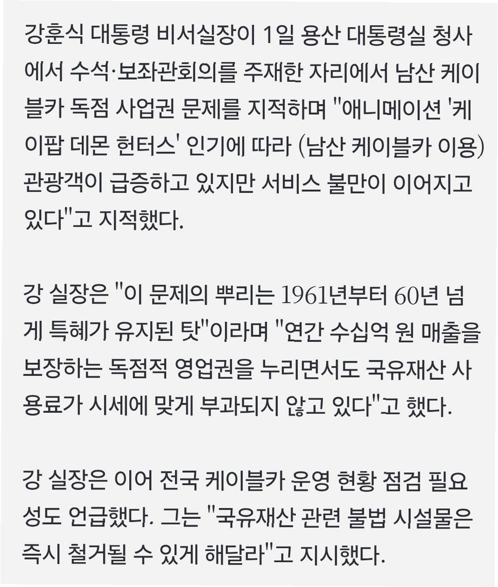 최근 남산 케이블카가 '케이팝데몬헌터스'의 인기에 힘입어 관광객 급증이라는 긍정적인 소식을 알렸습니다. 하지만, 이러한 긍정적인 소식 뒤에는 60년 넘게 이어져 온 독점 영업 형태와 서비스 품질에 대한 불만이 존재한다는 사실이 간과되어서는 안 됩니다. 강훈식 대통령 비서실장은 이러한 문제점을 지적하며, 개선 방안 마련을 지시했습니다. 이는 단순히 케이블카 사업의 문제를 넘어, 공정 경쟁과 국민 편의를 위한 중요한 시사점을 던져줍니다. 케이블카는 서울의 랜드마크인 남산의 아름다운 경치를 더욱 쉽게 즐길 수 있도록 돕는 중요한 역할을 합니다. 하지만, 독점적인 영업 형태는 서비스 개선의 동기를 저해하고, 결과적으로 소비자들의 불만을 야기할 수 있습니다. 이러한 상황을 개선하기 위한 구체적인 방안 마련이 시급합니다.
