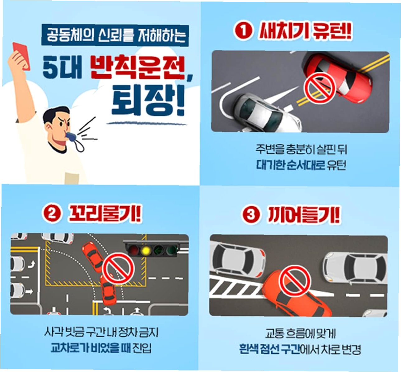 대한민국 경찰이 도로 위 운전자의 일탈 행위를 근절하기 위해 칼을 빼 들었습니다. 5대 반칙 운전 집중 단속을 통해 안전한 교통 문화를 만들겠다는 강력한 의지를 표명한 것입니다. 이 단속은 우리 모두의 안전을 위한 중요한 발걸음입니다.