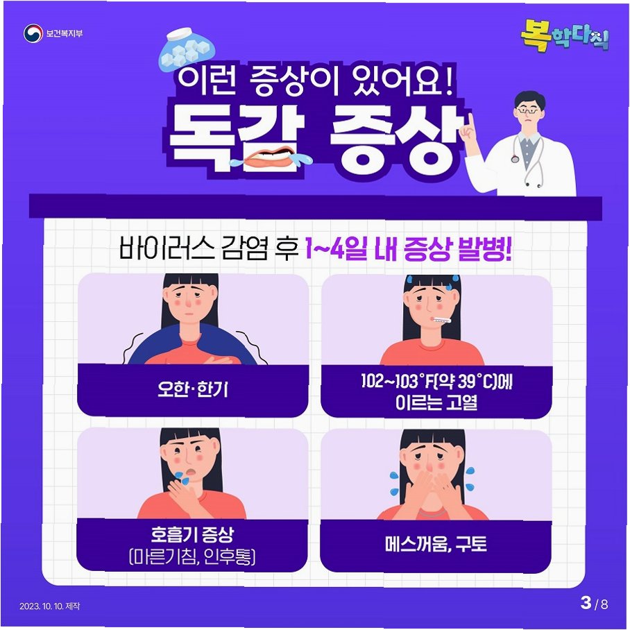 질병관리청은 “고위험군을 중심으로 지금이라도 호흡기 감염병을 막기 위한 예방접종에 적극적으로 참여해 달라”고 강조했습니다65세 이상과 임신부, 생후 6개월∼13세 어린이는 독감 무료 접종 대상입니다독감 예방접종은 독감 감염 위험을 줄이고, 감염되더라도 증상을 완화하는 데 효과적입니다. 아직 예방접종을 하지 않았다면, 지금이라도 가까운 병원을 방문하여 예방접종을 받는 것이 좋습니다.