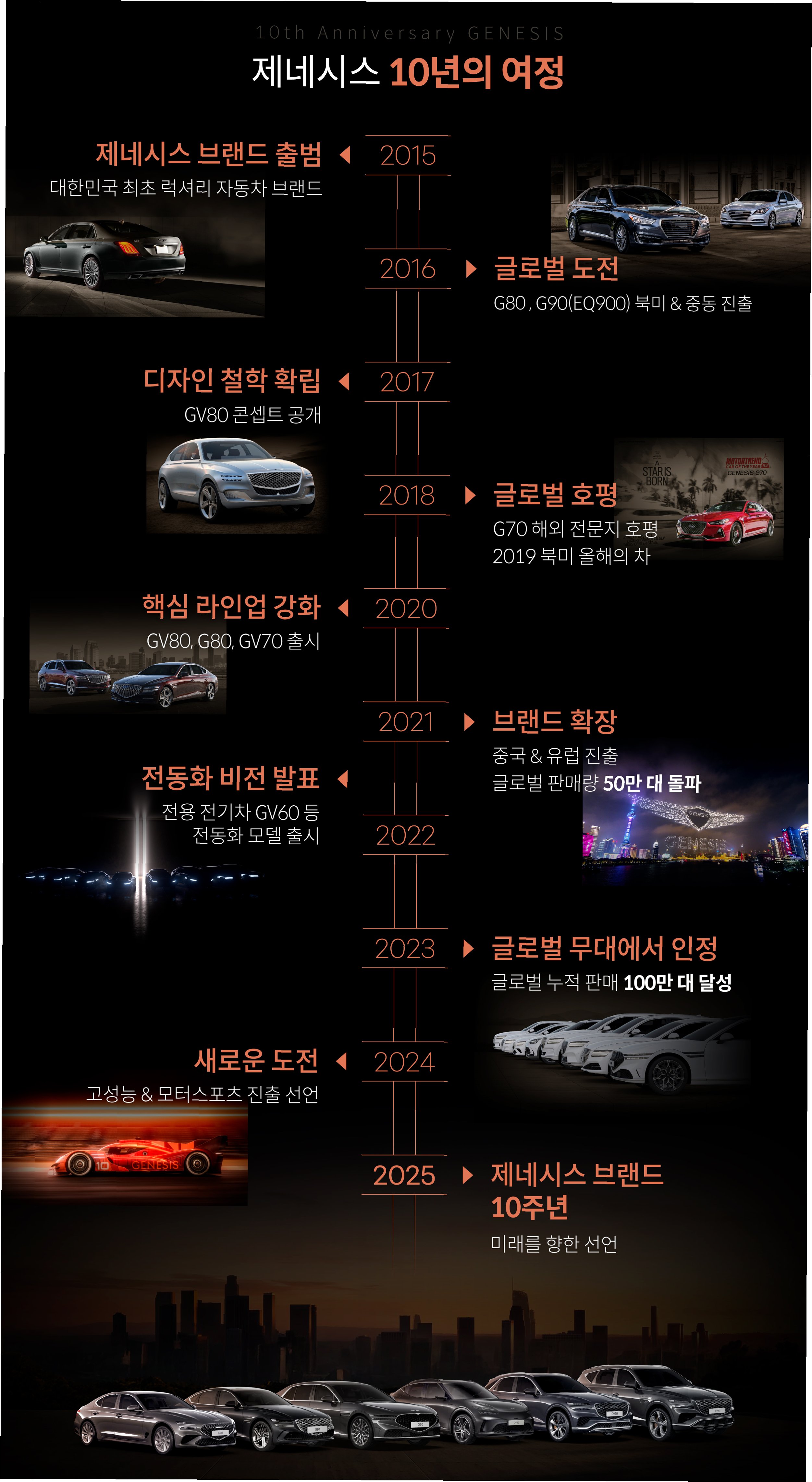 A.브랜드 출범 이후 꾸준히 성장하여 2023년에는 연간 22만 대를 판매했으며, 지난해 11월 기준 누적 판매량 150만 대를 돌파했습니다. 이는 제네시스가 글로벌 프리미엄 시장에서 확고한 입지를 구축했음을 보여줍니다.