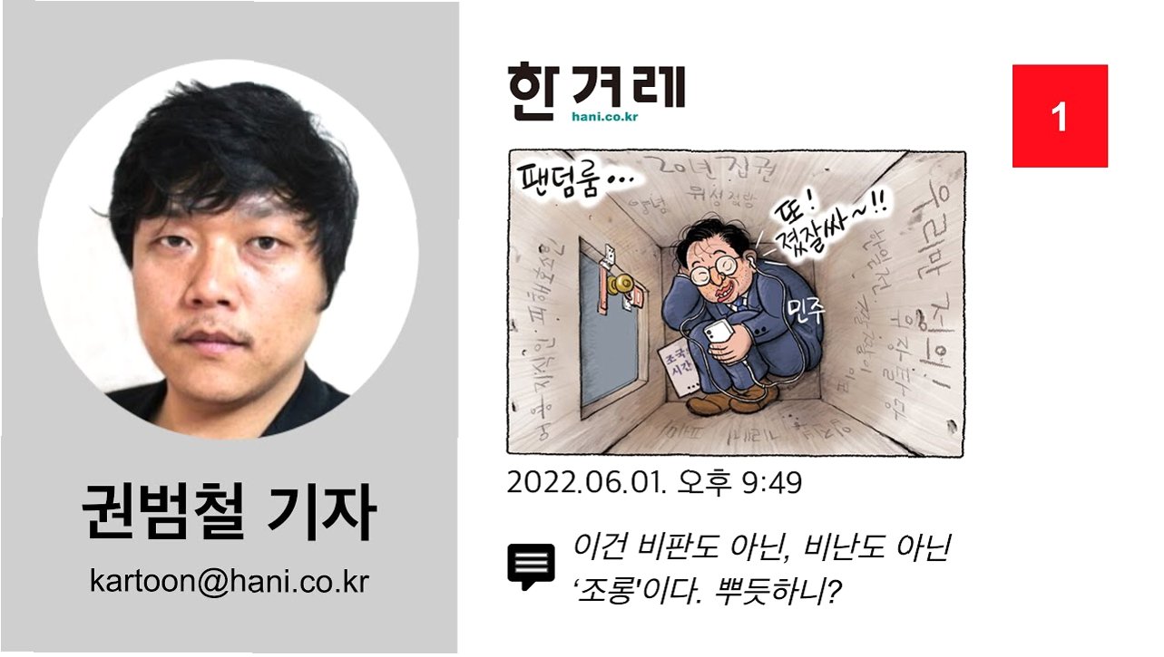 한겨레 그림판은 권범철 기자의 날카로운 시선과 유머를 통해 우리 사회의 다양한 면면을 보여주는 콘텐츠입니다. 그림 한 컷은 때로는 기사 백 개보다 더 강력한 메시지를 전달하며, 독자들에게 깊은 울림을 선사합니다. 그림판은 우리 시대의 풍자 정신을 대표하며, 독자들과의 소통을 통해 사회적 공감대를 형성합니다. 그림판은 오늘을 기록하고, 삶의 활력소가 되어 우리를 웃게 합니다. 한겨레 그림판은 단순한 그림이 아닌, 우리 시대의 이야기이자 우리 삶의 일부입니다.