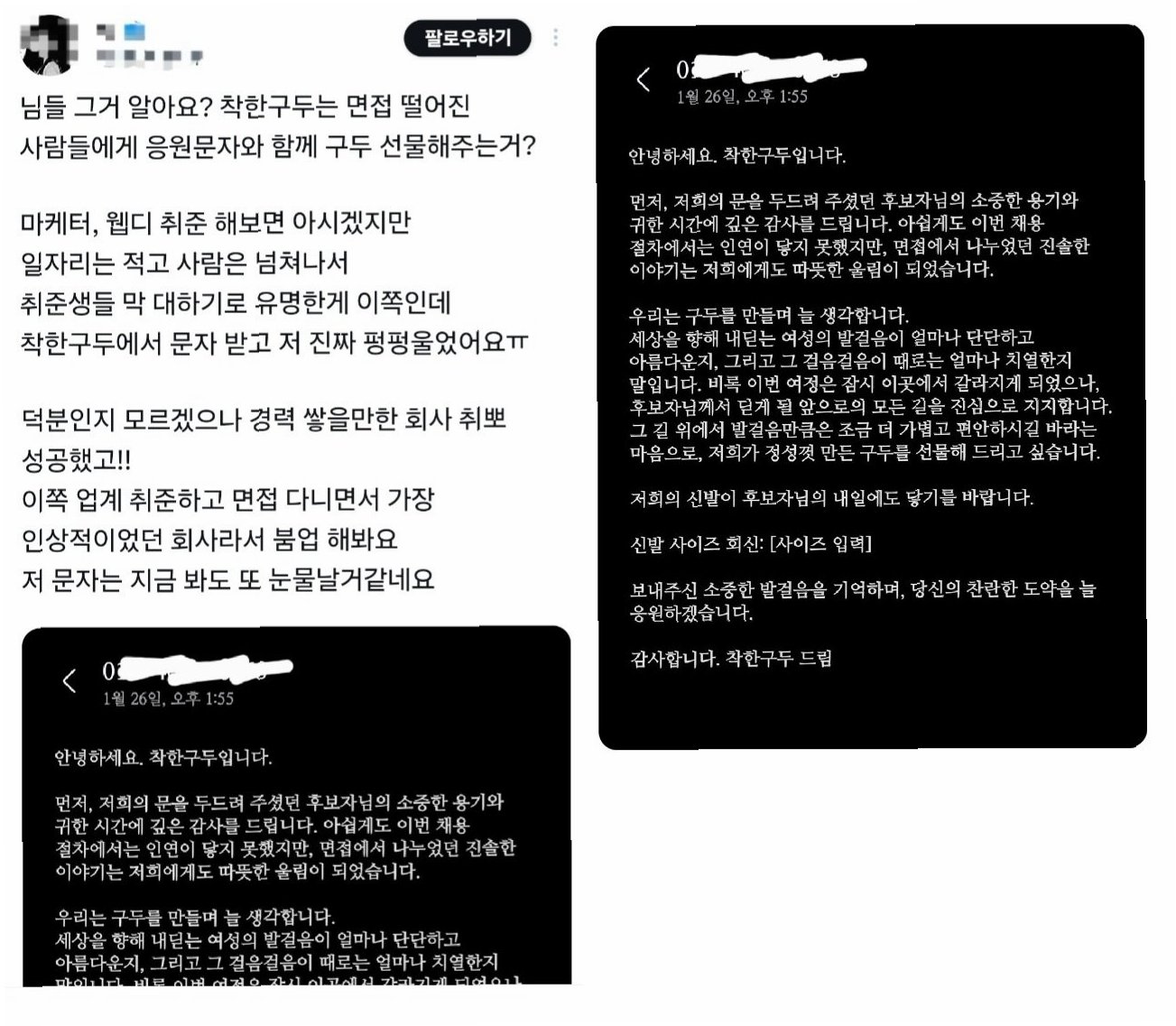 면접을 본 청년은 비록 합격하지는 못했지만, 해당 회사를 '가장 인상적인 회사'로 꼽으며 자신의 경험을 공유했습니다. 회사 측은 이 청년에게 진심 어린 응원의 메시지와 함께 직접 제작한 구두를 선물했습니다. 예상치 못한 선물에 청년은 "문자를 받고 펑펑 울었다"며 깊은 감사함을 표현했으며, "덕분에 취업에 성공했다"는 후일담을 전해 훈훈함을 더했습니다.