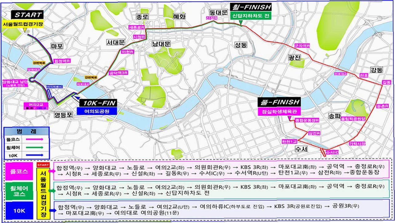 마라톤 코스는 상암동에서 시작하여 합정역, 여의도, 잠실을 지나 올림픽공원에 이르는 환상적인 여정으로 구성됩니다. 이 코스는 서울의 랜드마크들을 지나며, 참가자들에게 서울의 다채로운 매력을 선사할 것입니다. 서울의 아름다운 풍경을 배경으로 펼쳐지는 마라톤은 참가자뿐만 아니라, 지켜보는 모든 이들에게 잊을 수 없는 감동을 선사할 것입니다.