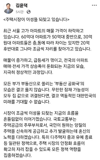 김윤덕 국토교통부 장관은 최근 서울 고가 아파트 매물 가격이 하락세를 보이며 주택시장이 이성을 되찾고 있다고 진단했습니다60억대 아파트가 50억대 중반으로, 30억대 아파트들은 20억 후반대로 가격이 조정되는 현상을 언급하며, 이는 지극히 정상적인 과정이라고 평가했습니다. 현재 부동산 시장은 매물이 증가하고 급등세가 꺾이며 전국 아파트 매매·전세 가격 상승폭이 둔화되는 추세입니다.