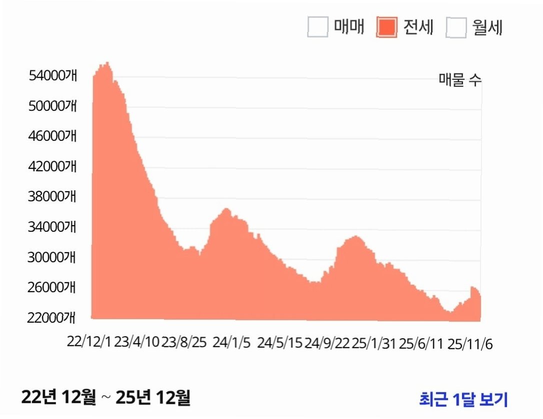 A.임대차 시장의 불확실성과 고금리 환경 속에서 기존 세입자들이 이사를 미루고 갱신 계약을 선택하는 비중이 늘면서 신규 매물 자체가 줄어들었기 때문입니다. 또한, 전세 공급 부족은 월세 상승을 유발하고, 이는 다시 전세 수요를 자극하는 악순환을 만들고 있습니다.