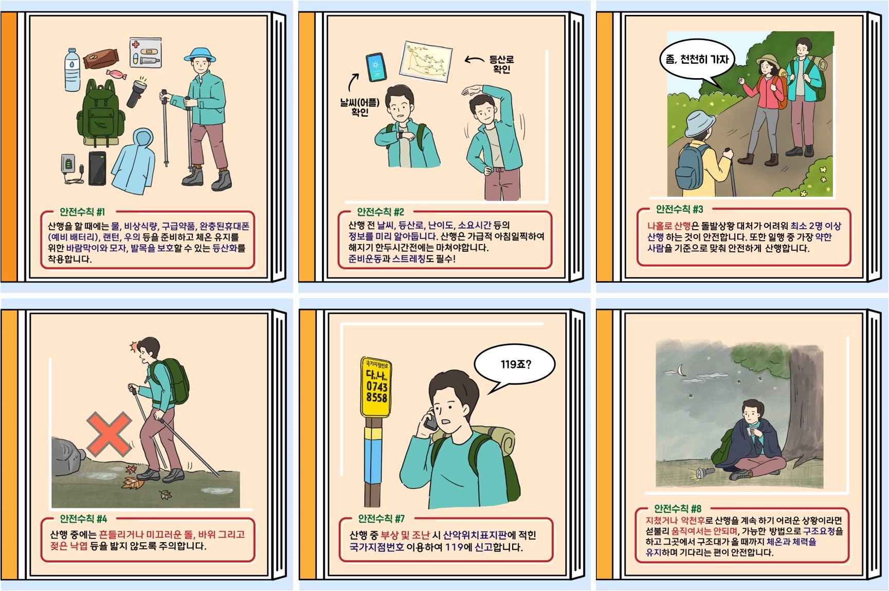 A.등산 전 기상 상황을 확인하고, 안전 장비를 착용하며, 혼자보다는 일행과 함께 산행하는 것이 좋습니다. 또한, 응급 상황에 대비하여 비상 연락망을 준비하고, 구조 요청 방법을 숙지해야 합니다.