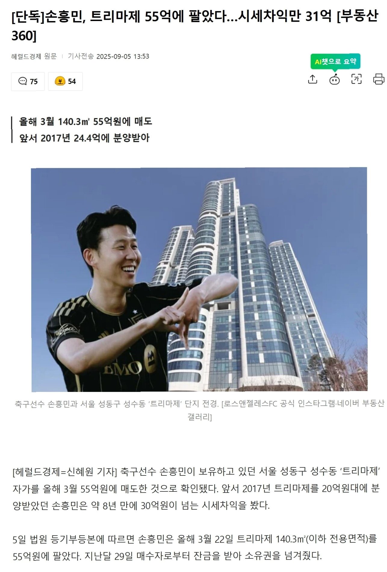 손흥민, 성수동 트리마제 매각으로 30억 원 시세차익! 부동산 투자 성공 비결은?