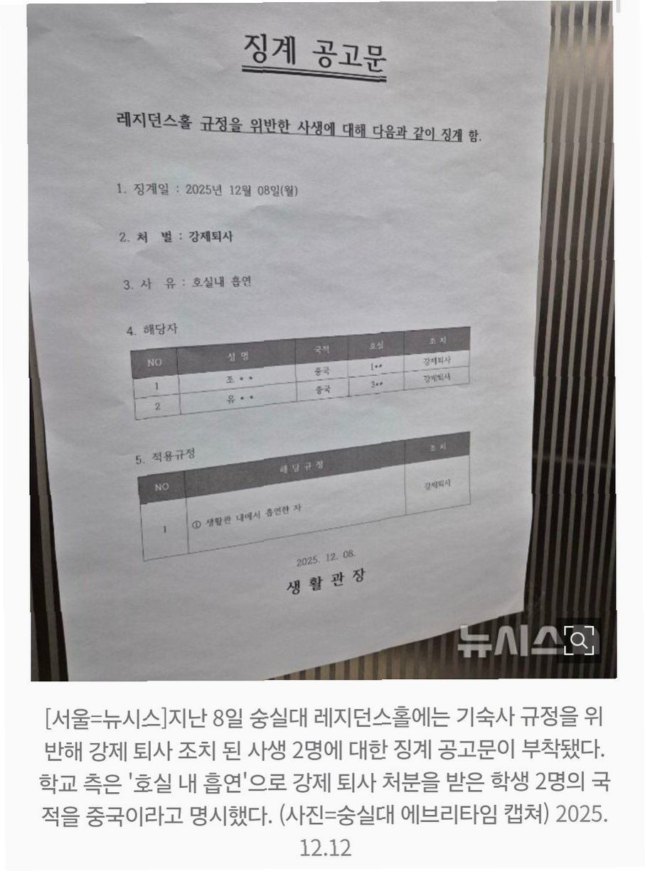 최근 숭실대학교에서 기숙사 퇴사 조치된 학생들의 징계 사실을 공지하면서, 징계 대상자의 국적을 함께 표기하여 '혐중 정서'를 부추겼다는 비판이 제기되었습니다. 숭실대 기숙사 레지던스홀에 부착된 징계 공고문에는 규정 위반으로 퇴사 조치된 학생 2명의 이름, 학번 일부와 함께 국적이 중국으로 명시되었습니다. 이는 대학 측의 의도와는 무관하게, 학생들 사이에서 혐오 정서를 확대하는 결과를 초래했습니다. 징계 사유와 무관한 국적 정보를 공개한 행위는, 익명 커뮤니티를 통해 중국인 유학생을 향한 비판과 혐오 표현으로 이어졌습니다. 대학 측은 국적 표기를 재검토하겠다는 입장을 밝혔지만, 이번 사건은 학교의 공지 방식이 사회적 파급력에 대해 얼마나 신중해야 하는지를 보여주는 사례입니다. 숭실대는 징계 공고에 국적을 밝힌 이유에 대해 명확한 입장을 밝히지 않았지만, 학생들의 반발이 거세지자 국적 표기 방식을 재검토하겠다고 밝혔습니다. 이 사건은 혐오 표현의 확산과 대학의 책임에 대한 중요한 질문을 던지고 있습니다.