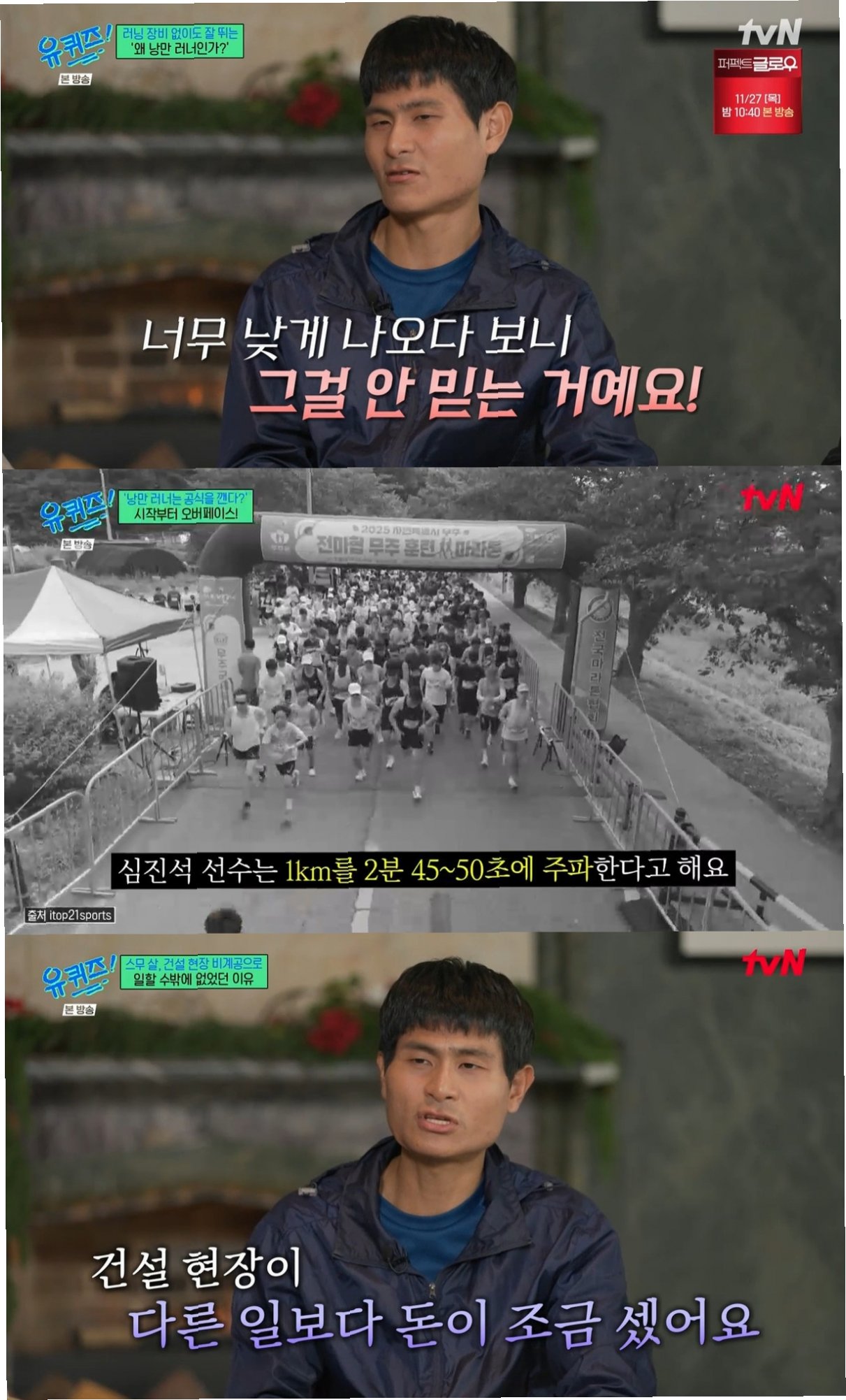 유튜브 '낭만러저'로 활동하며 올해 전국 아마추어 마라톤 대회를 휩쓴 심진석 씨가 tvN '유 퀴즈 온 더 블럭'에 출연하여 그의 놀라운 이야기들을 풀어놓았습니다. 유재석은 그를 '올해 전국 아마추어 마라톤 1위를 연달아 휩쓴 주인공'이라고 소개하며, 심진석 씨의 특별한 기록과 철학에 대한 궁금증을 자아냈습니다. 그의 마라톤 여정은 단순한 스포츠를 넘어선 감동과 열정을 선사하며 많은 이들에게 영감을 주고 있습니다.
