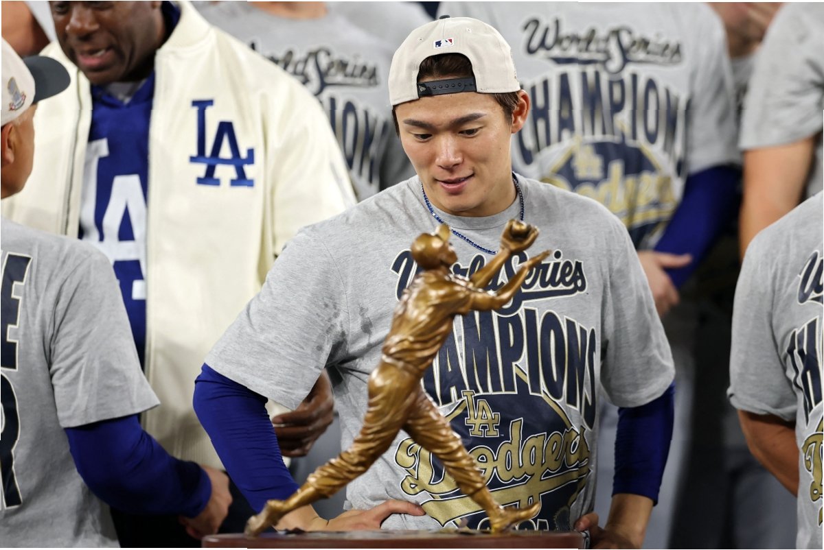 야마모토는 2차전 선발 등판하여 9이닝 1실점 완투승을 거두는 등 총 3경기(2선발)에서 3승 무패 평균자책점 1.02를 기록하며 시리즈 MVP를 차지했습니다. 단일 월드시리즈 3승은 2001년 랜디 존슨 이후 24년 만이며, '원정 3승'은 역대 최초의 기록입니다. 야마모토는 샴페인 파티의 주인공이 되었고, 동료들의 집중 포화를 받았습니다.