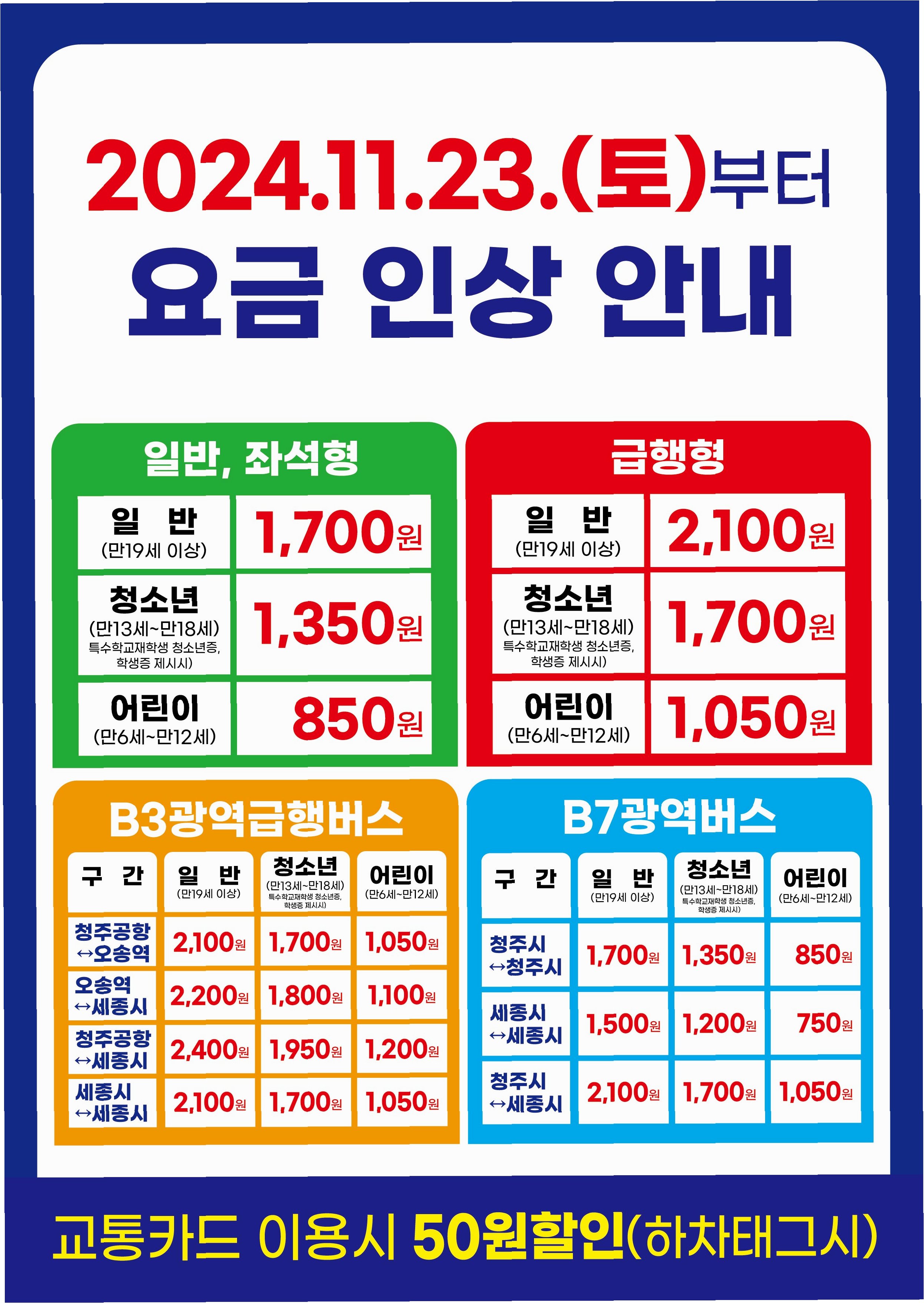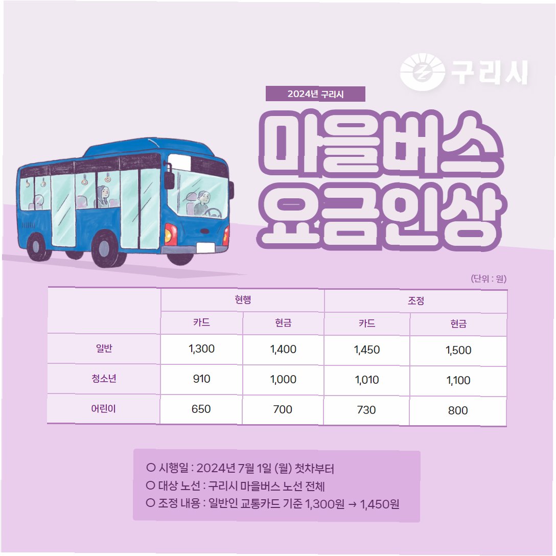 지역별 차등 적용: 마을버스 및 좌석·리무진버스 요금