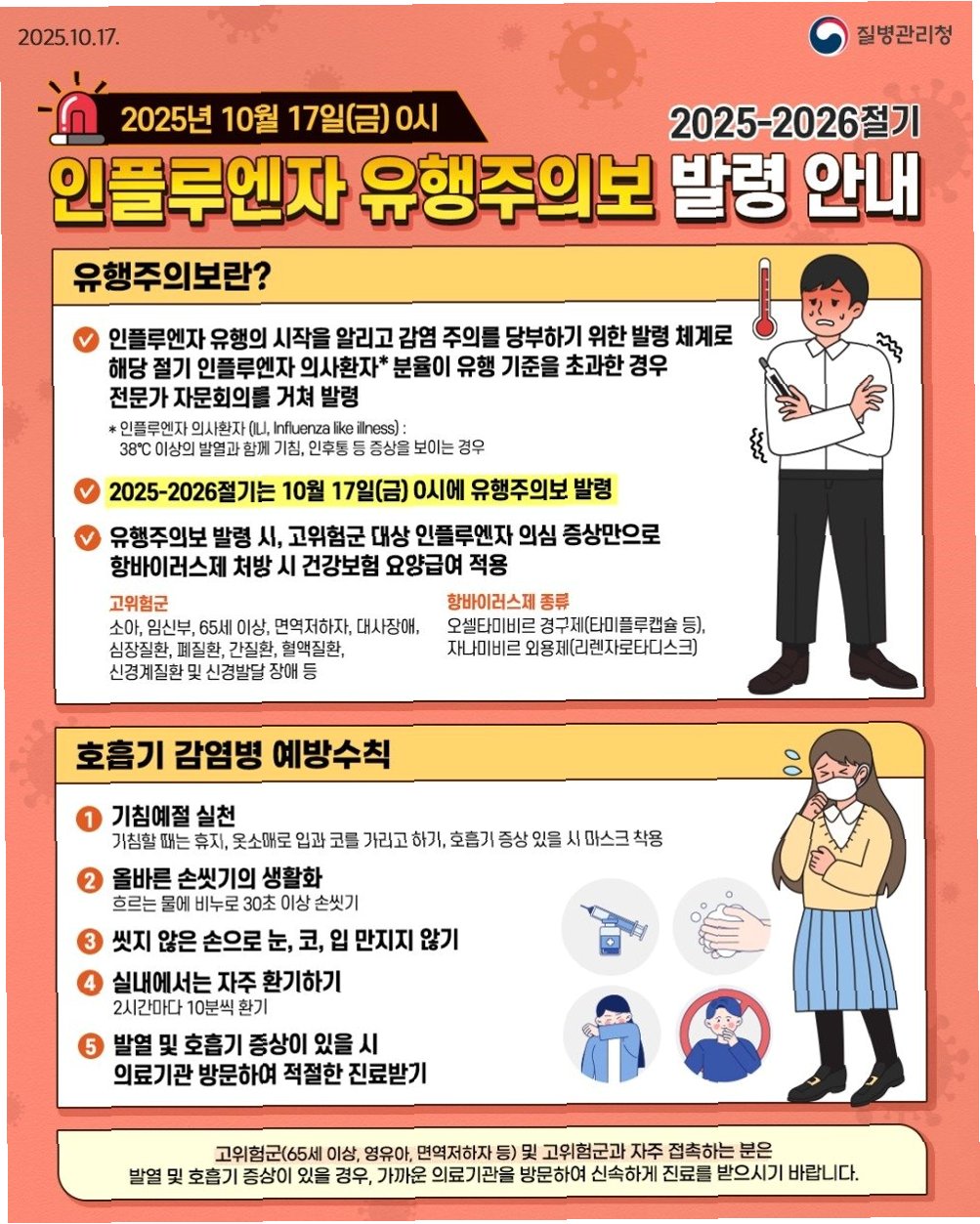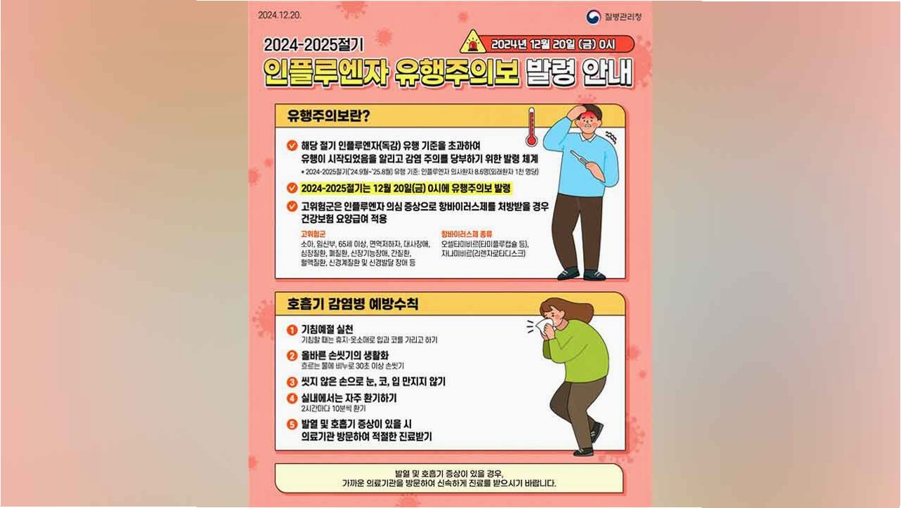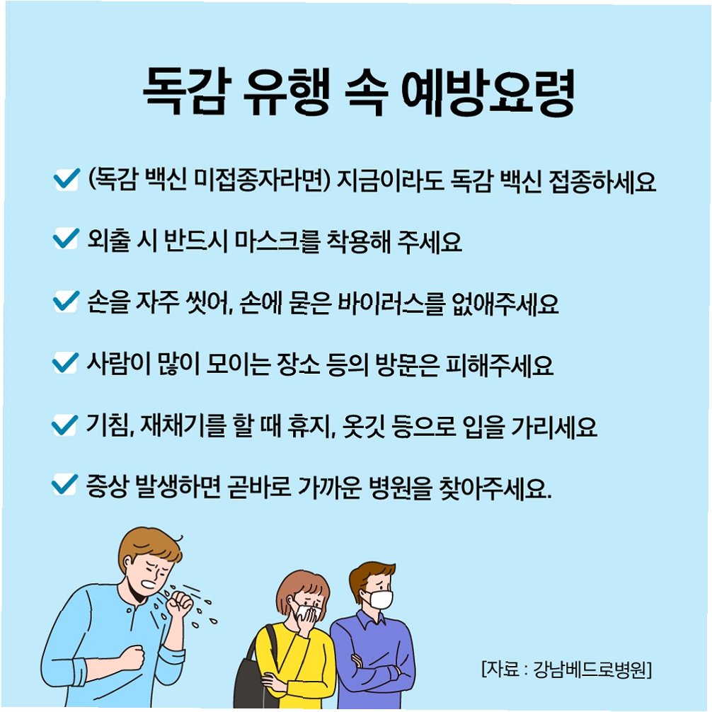 독감 예방을 위해서는 개인위생 관리가 매우 중요합니다. 기침이나 발열 등 호흡기 증상이 있는 경우에는 마스크를 착용하고, 손 씻기를 생활화하며, 주기적인 환기를 통해 바이러스 확산을 막아야 합니다. 또한, 독감 유행은 길게는 내년 5월 초까지 지속될 수 있으므로, 꾸준한 관리가 필요합니다. 건강한 생활 습관을 유지하고, 의심 증상이 나타나면 즉시 의료기관을 방문하여 적절한 치료를 받는 것이 중요합니다.