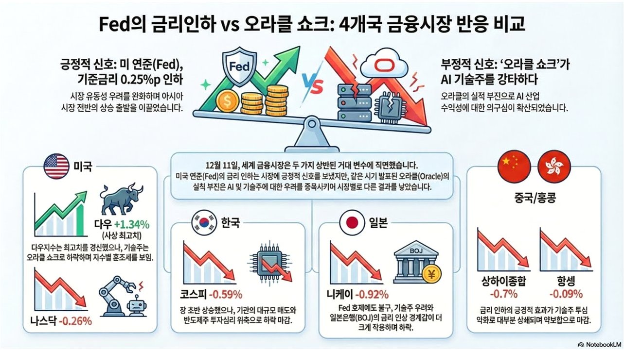 뉴욕 증시는 오라클의 데이터센터 투자 유치 실패와 AI 관련주들의 하락으로 인해 큰 폭의 하락을 겪었습니다. 시장은 금리 인하에 대한 불확실성 속에서 11월 CPI 발표를 기다리고 있으며, 전문가들은 시장이 내년에 일어날 일에 대비해 방어적인 자세를 취하고 있다고 분석했습니다. 투자자들은 시장 변동성에 유의하며, 보수적인 투자 전략을 고려해야 할 시점입니다.