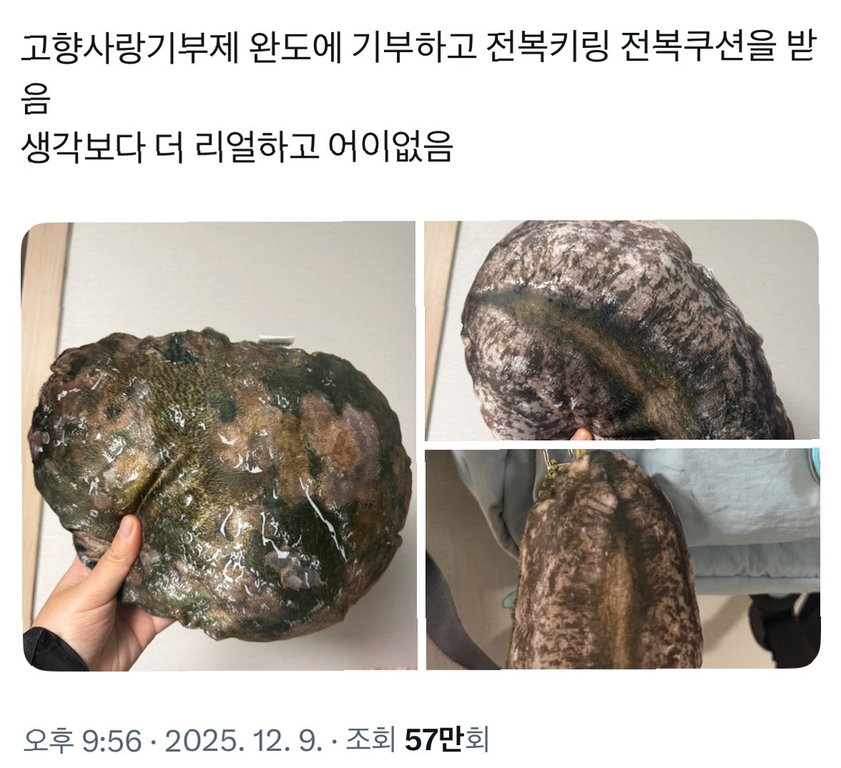 고향사랑기부제 완도 답례품, 전복 쿠션의 놀라운 리얼리티로 화제! '징그럽다' vs '재밌다' 엇갈린 반응 속, 완도의 독창적인 답례품 전략은 기부자들의 마음을 사로잡고 지역 경제 활성화에도 기여합니다.
