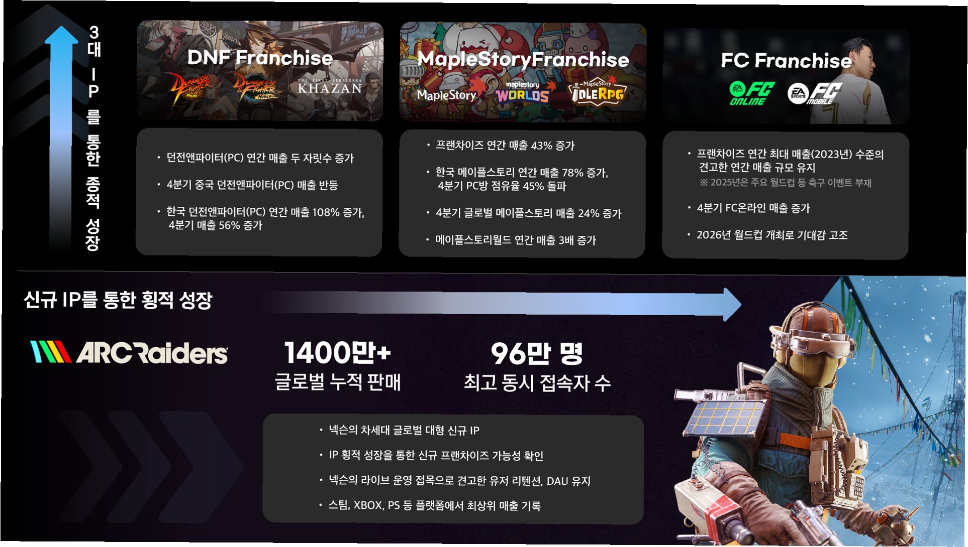 넥슨은 역대 최대 매출에도 불구하고 신작 개발비 부담과 출시 지연으로 수익성 악화를 겪고 있다는 판단 하에 '체질 개선'을 전면에 내세웠습니다. 기준 미달 프로젝트는 과감히 정리하고, 넥슨이 추구하는 방향에 부합하는 신작 개발 및 인수합병에 집중할 방침입니다. 특히 엠바크 스튜디오의 효율적인 개발 문화를 이식하여 '적은 인력으로 AAA급 신작을 뽑아내는' 슬림한 구조 구축에 주력하고 있습니다. 이는 '아크레이더스' 개발사인 엠바크 스튜디오의 성공 사례를 바탕으로 합니다.