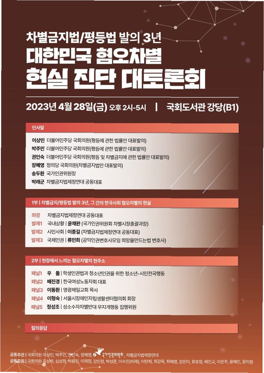김지학 한국다양성연구소 소장은 혐오를 '특정 소수자집단에 대해 이 세상에 없어도 된다고 말하는 우생학적 접근'이라고 정의했습니다. 이러한 혐오가 일상화되는 상황에서 차별금지법 제정은 혐오를 막는 중요한 방파제 역할을 합니다. 그러나 차별금지법 제정은 정치적인 이유로 인해 속도를 내지 못하고 있으며, 이는 혐오 문제를 더욱 심화시키는 요인으로 작용합니다.