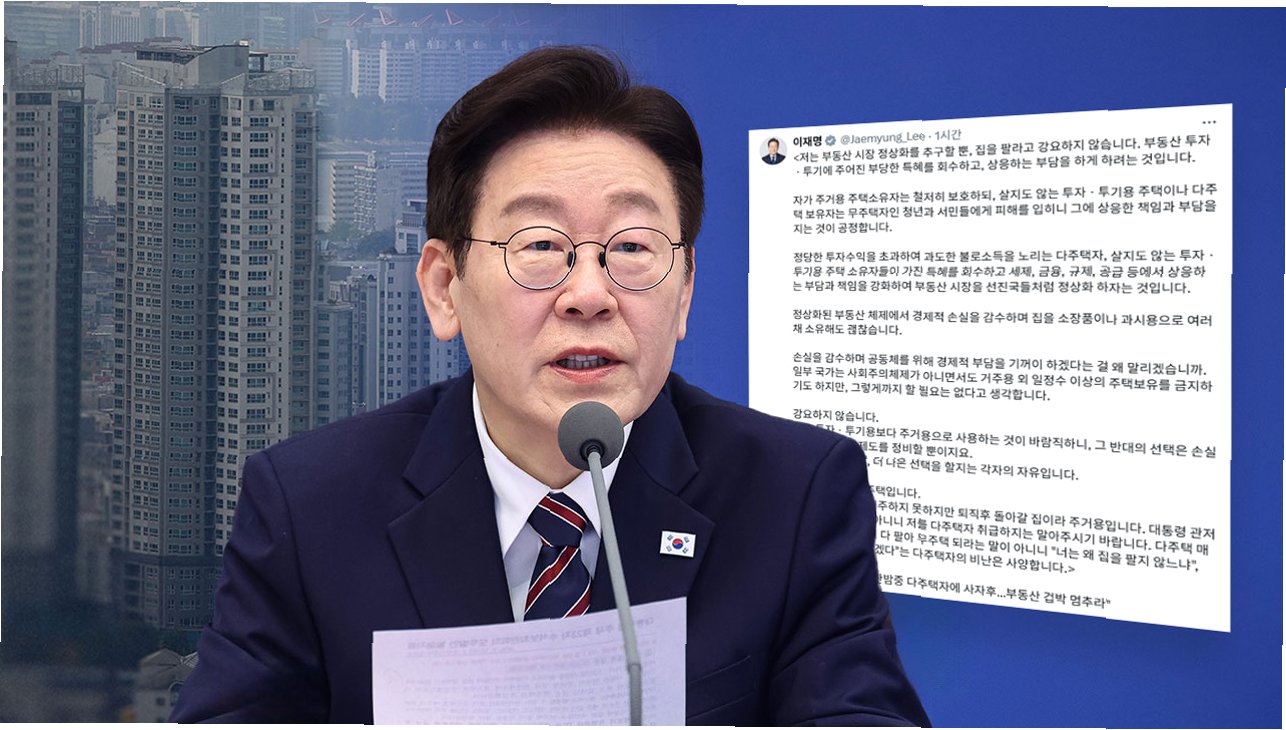 이 대통령은 국민의힘이 연이은 부동산 메시지를 비판하는 것에 대해 '작은 땅덩이에 수도권 집중까지 겹쳐 부동산 투기 요인이 많은 대한민국에서 소수의 투자·투기용 다주택 보유를 바람직하다고 생각하는 것이냐'며 '설마 그 정도로 상식이 없지는 않을 것'이라고 꼬집었습니다. 또한, 폐해가 큰 다주택에 대한 특혜의 부당함과 규제 강화의 필요성을 알면서도 시비에 가까운 비난을 하는 국민의힘의 태도에 안타까움을 표했습니다.
