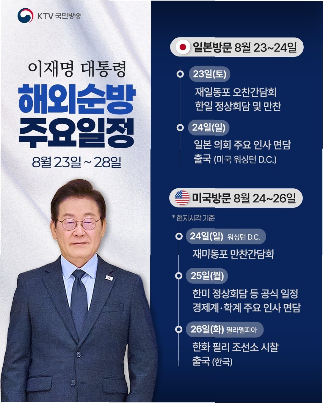 이 대통령은 미국 방문 일정을 마무리한 후, 필라델피아로 이동하여 현지 조선소를 시찰할 예정입니다. 이번 순방은 한일 관계 개선과 한미 동맹 강화를 위한 중요한 외교적 노력의 일환으로, 양국과의 관계를 더욱 발전시키는 데 기여할 것입니다. 이 대통령은 모든 일정을 마치고 28일 귀국할 예정이며, 이번 순방의 결과는 향후 대한민국 외교 정책에 중요한 영향을 미칠 것으로 예상됩니다.
