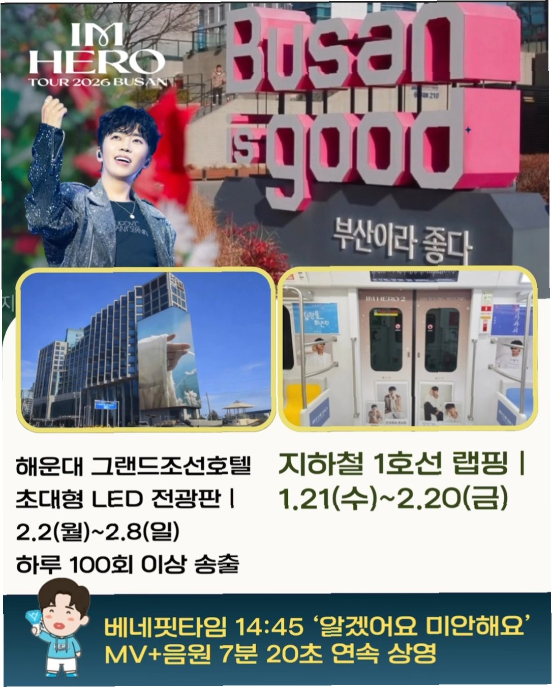가수 임영웅이 전국투어 콘서트 ‘아임 히어로’의 마지막 여정을 부산에서 시작합니다. 이번 부산 공연은 인천, 대구, 서울, 광주, 대전 등 전국을 뜨겁게 달궜던 투어의 대미를 장식하는 무대로, 팬클럽 영웅시대와 함께 특별한 추억을 나눌 예정입니다. 임영웅은 부산 벡스코에서 팬들과 잊지 못할 시간을 선사할 것입니다.