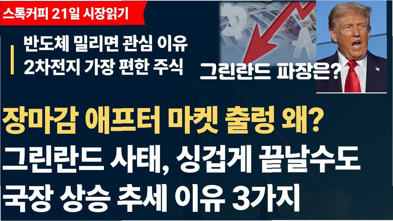 최근 글로벌 정치·경제적 불확실성이 커지면서 국내 증시가 불안정한 모습을 보이고 있습니다. 특히, 도널드 트럼프 전 미국 대통령의 '그린란드' 관련 발언이 촉발한 지정학적 리스크가 시장에 큰 파장을 일으키고 있습니다. 이러한 상황은 투자자들의 심리를 위축시키고, 주가 하락을 부추기는 요인으로 작용하고 있습니다. 불확실성이 증폭될수록, 투자자들은 더욱 신중한 자세로 시장에 임해야 할 것입니다.