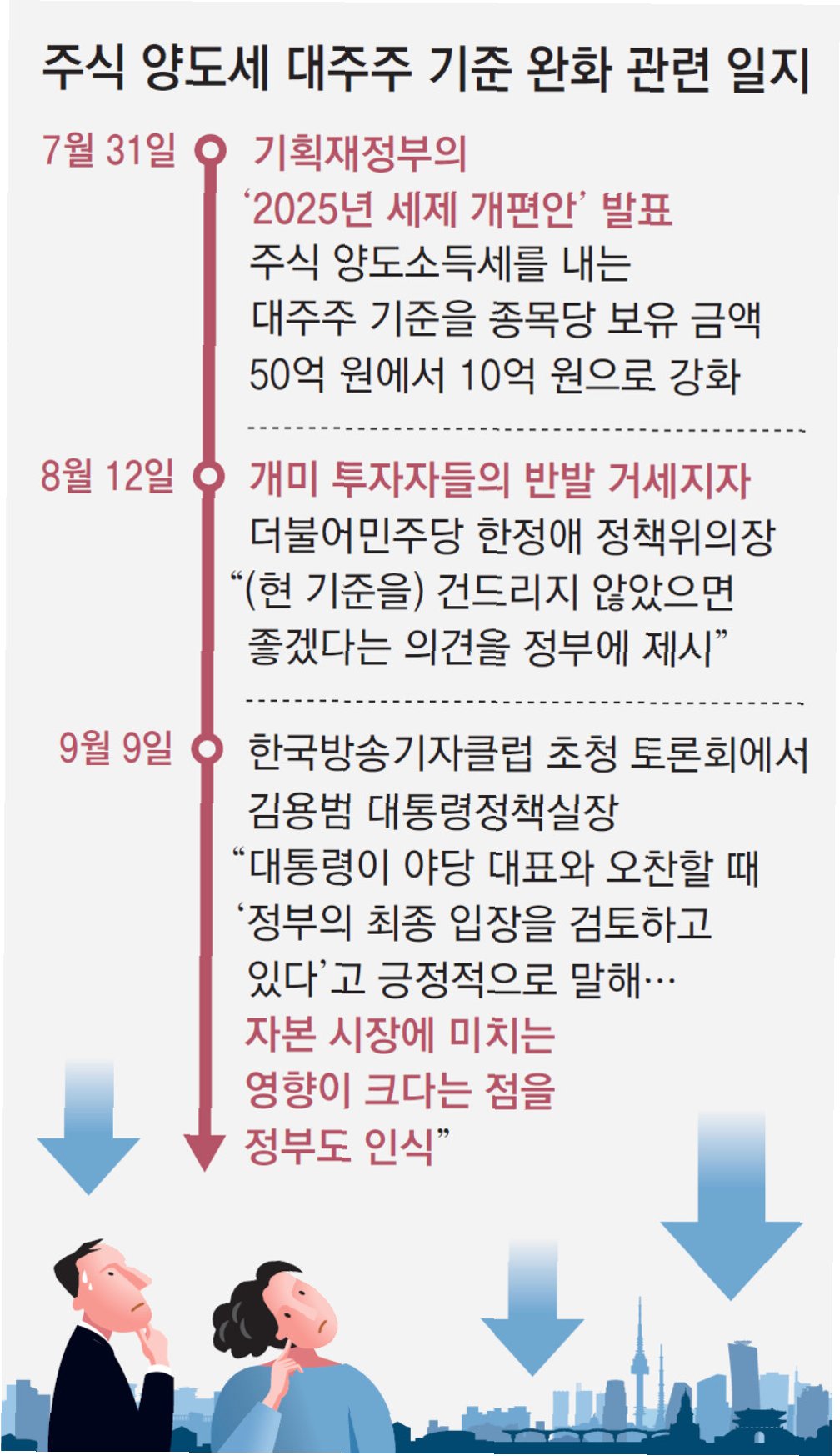 주식 양도세 대주주 기준 변경 논란은 대통령의 결정으로 국회로 넘어가, 50억 원 기준 유지를 검토 중입니다. 시장 심리, 세수, 정책 목표 간의 균형을 고려한 결정으로, 국회의 논의 결과에 따라 시장의 향방이 결정될 것입니다.