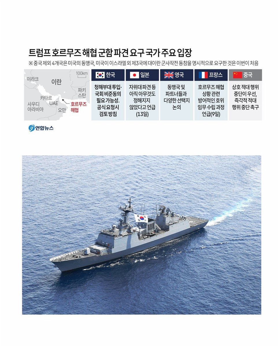아시아 주요 동맹국들도 트럼프 대통령의 요구에 거리를 두는 모습이다. 일본은 자국 헌법과 집단자위권 발동 요건을 이유로 군함 파견 결정이 내려진 바 없다고 밝혔다. 한국 정부 역시 즉각적인 참여 약속 대신 '충분한 검토 시간이 필요하다'는 입장을 내놓았다. 중국은 시진핑 주석이 직접 나서 우회적으로 거부 의사를 밝히고, 외교부는 모든 국가의 군사 행동 중단을 촉구하며 물밑 외교에 집중하는 전략을 택했다.