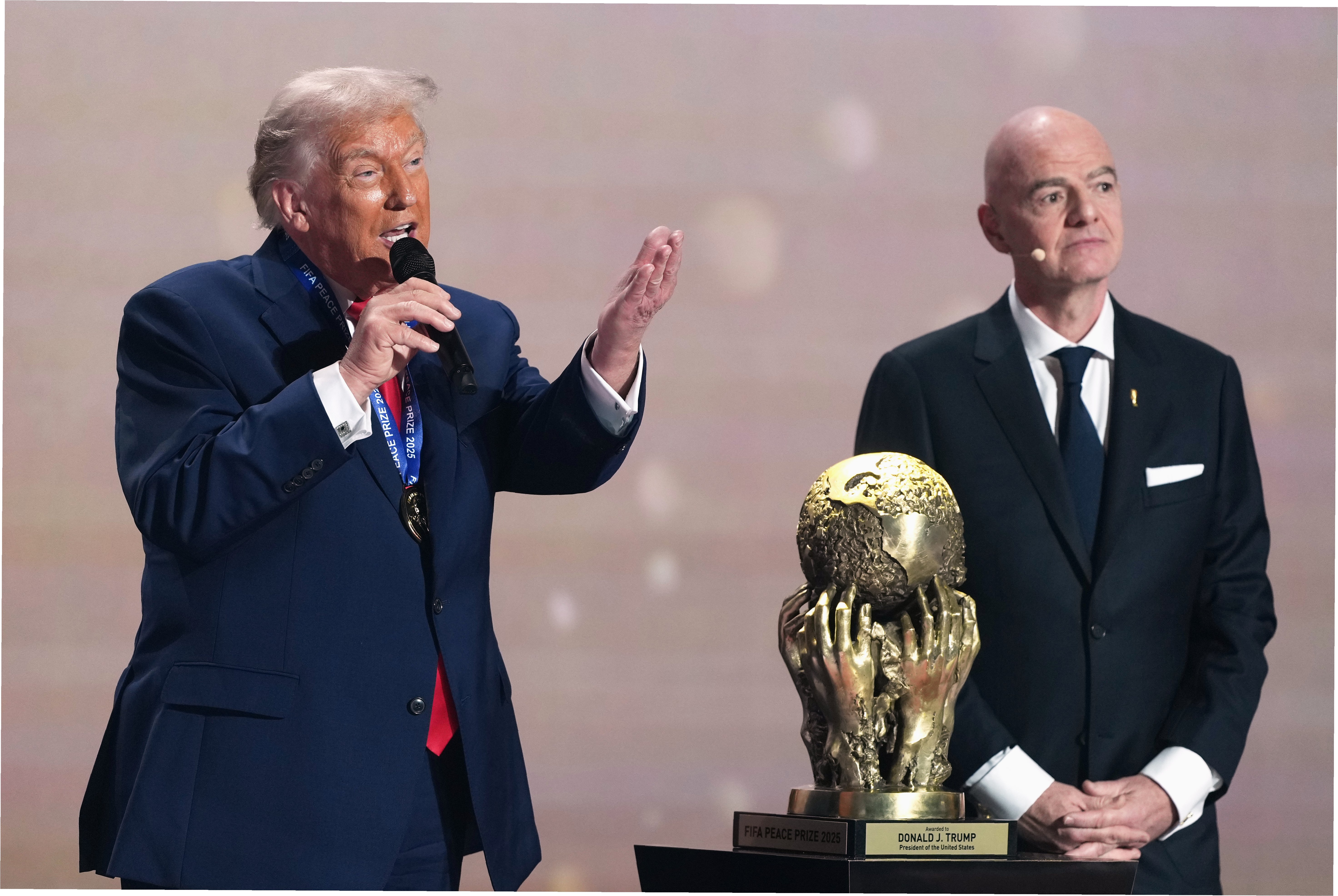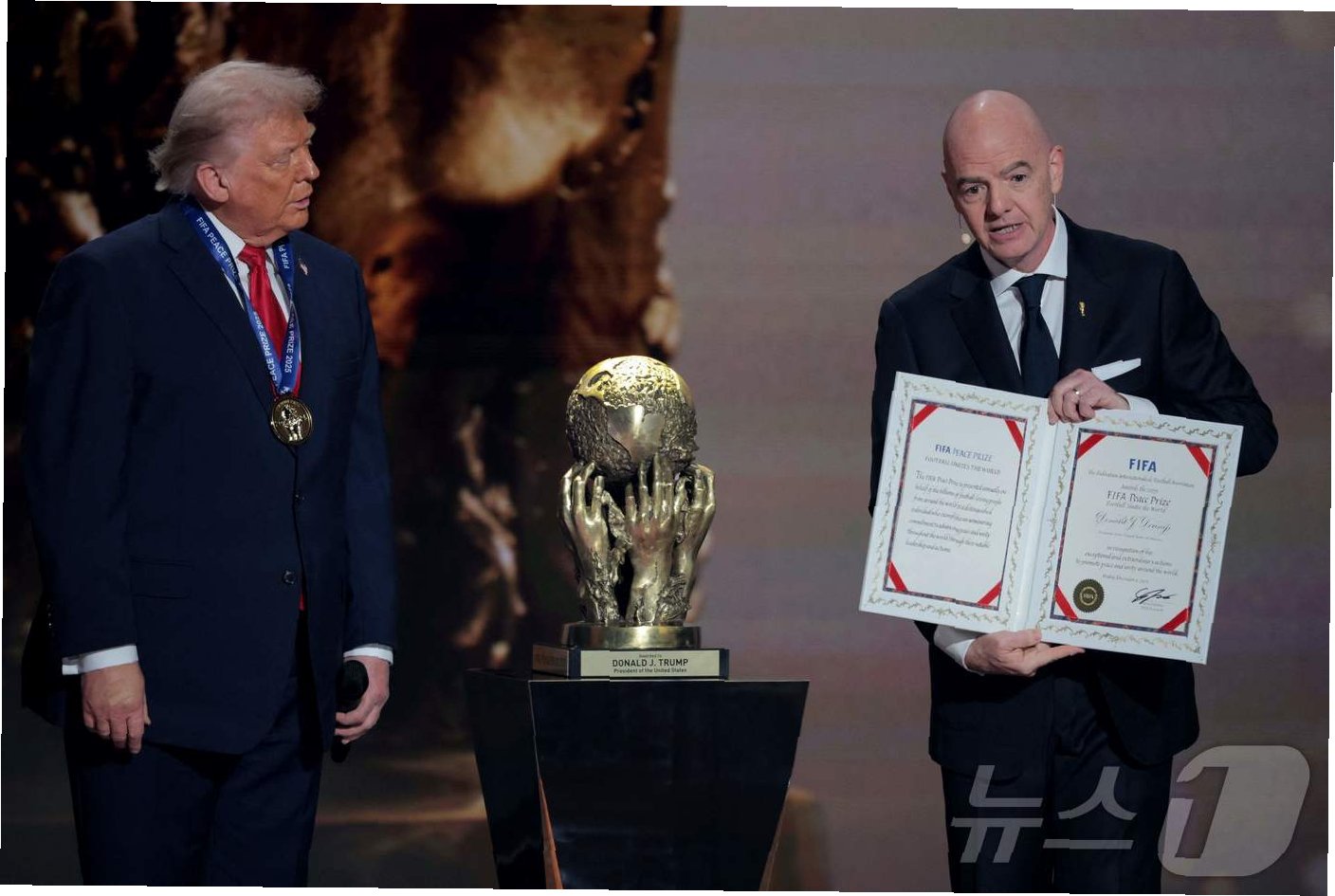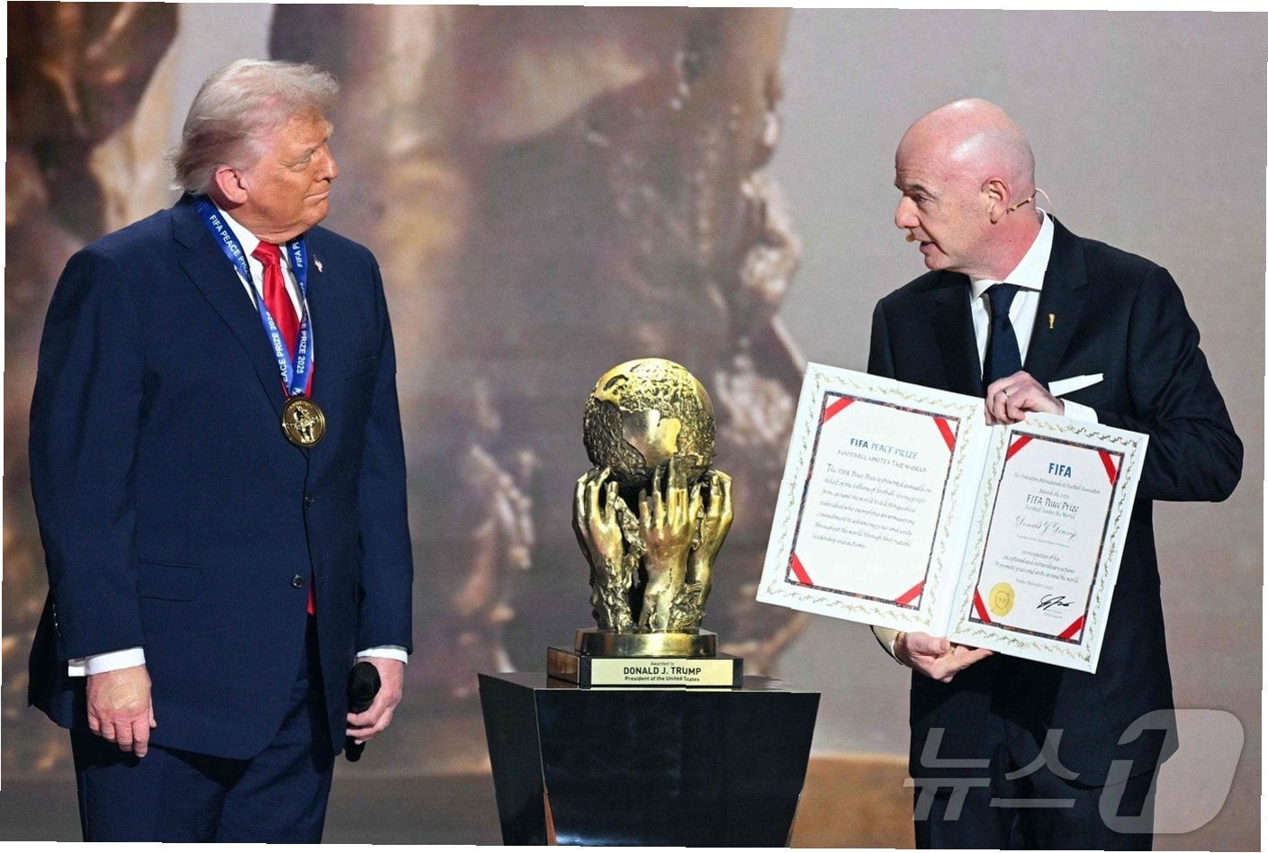 도널드 트럼프 전 미국 대통령이 국제축구연맹(FIFA)이 신설한 FIFA 평화상을 수상했습니다. 잔니 인판티노 FIFA 회장은 5일(현지시간) 미국 워싱턴 D.C. 케네디 센터에서 열린 2026 북중미 월드컵 본선 조 추첨식 무대에서 트럼프 대통령에게 메달과 함께 인증서를 전달했습니다. 인판티노 회장은 FIFA 평화상이 전 세계 평화와 단합을 증진하는 데 헌신한 개인에게 수여된다고 밝혔습니다.