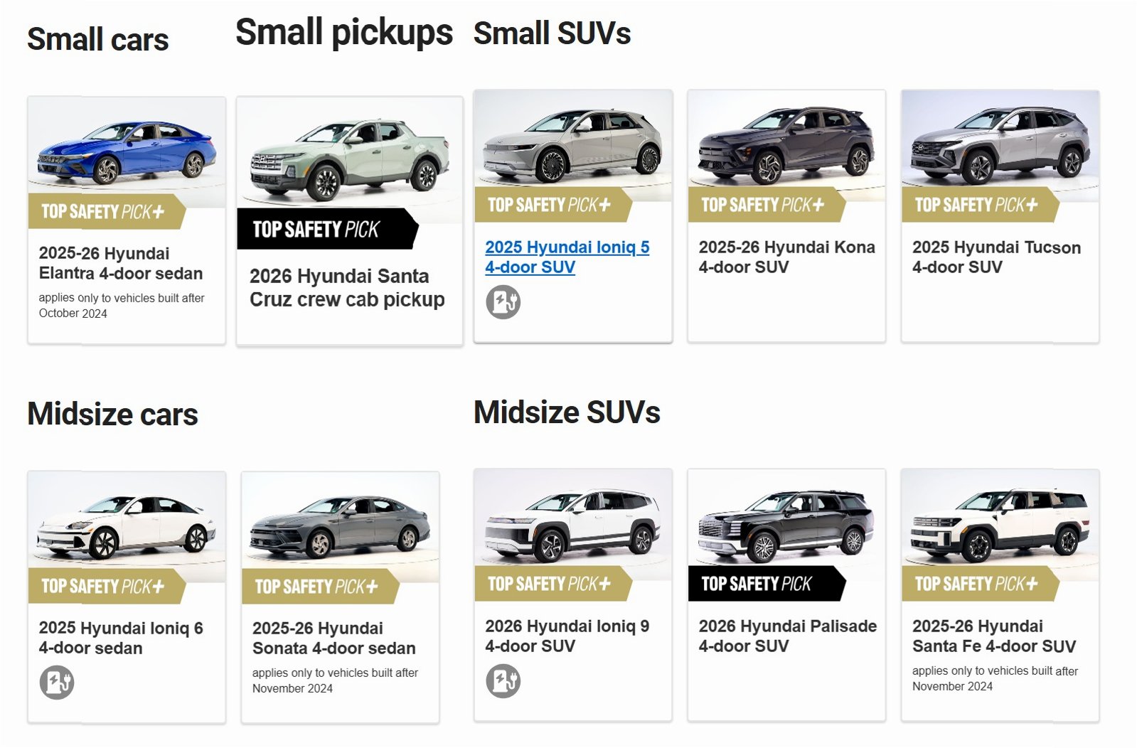 올해 TSP+ 등급을 획득한 모델을 브랜드별로 살펴보면 현대차는 ▲아이오닉5 ▲아이오닉6 ▲아이오닉9 ▲코나 ▲투싼 ▲싼타페 ▲아반떼(현지명 엘란트라) ▲쏘나타 등 8개 차종이다. 기아는 ▲EV9 ▲스포티지 ▲쏘렌토 ▲텔루라이드 ▲K4 등 5개 차종이다. 제네시스는 ▲GV60 ▲GV70 ▲GV70 전동화 모델 ▲GV80 ▲G80 등 5개 차종이다.