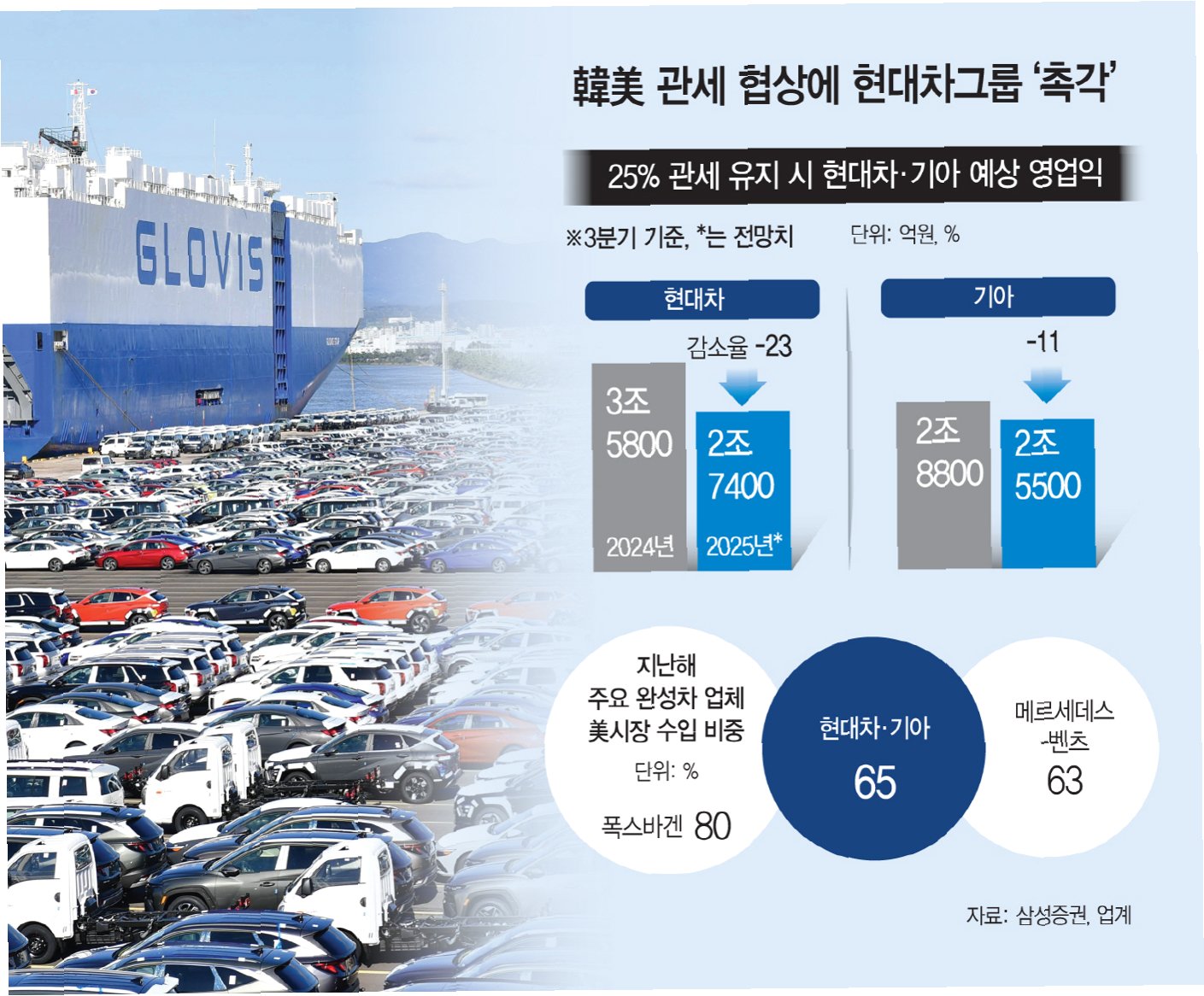 A.미국의 자동차 관세 인하 지연, 경쟁 심화, 원자재 가격 상승 등이 복합적으로 작용하여 영업이익이 감소했습니다.