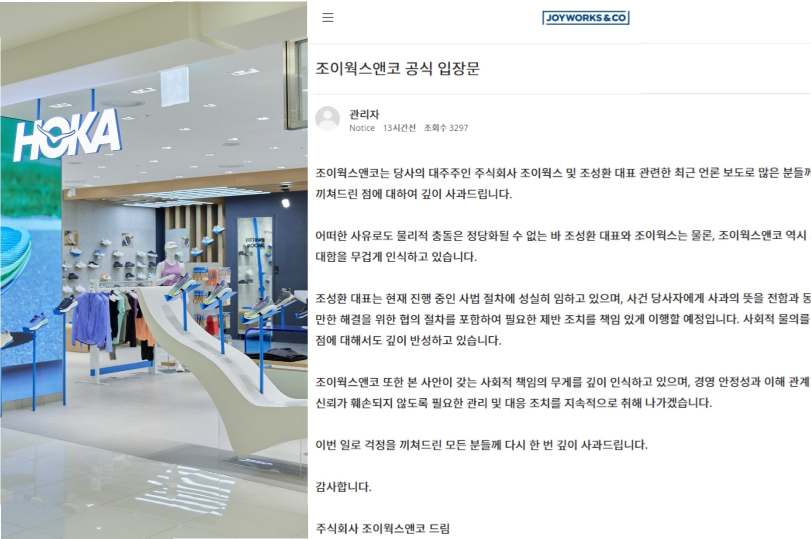 사건이 알려지면서 온라인에서는 호카 불매 운동이 확산되고 있습니다. 이에 조이웍스앤코는 회사 명의로 사과문을 발표하며, 어떠한 사유로도 물리적 충돌은 정당화될 수 없다는 입장을 밝혔습니다. 조 대표는 현재 진행 중인 사법 절차에 성실하게 임하고 있다고 덧붙였습니다.