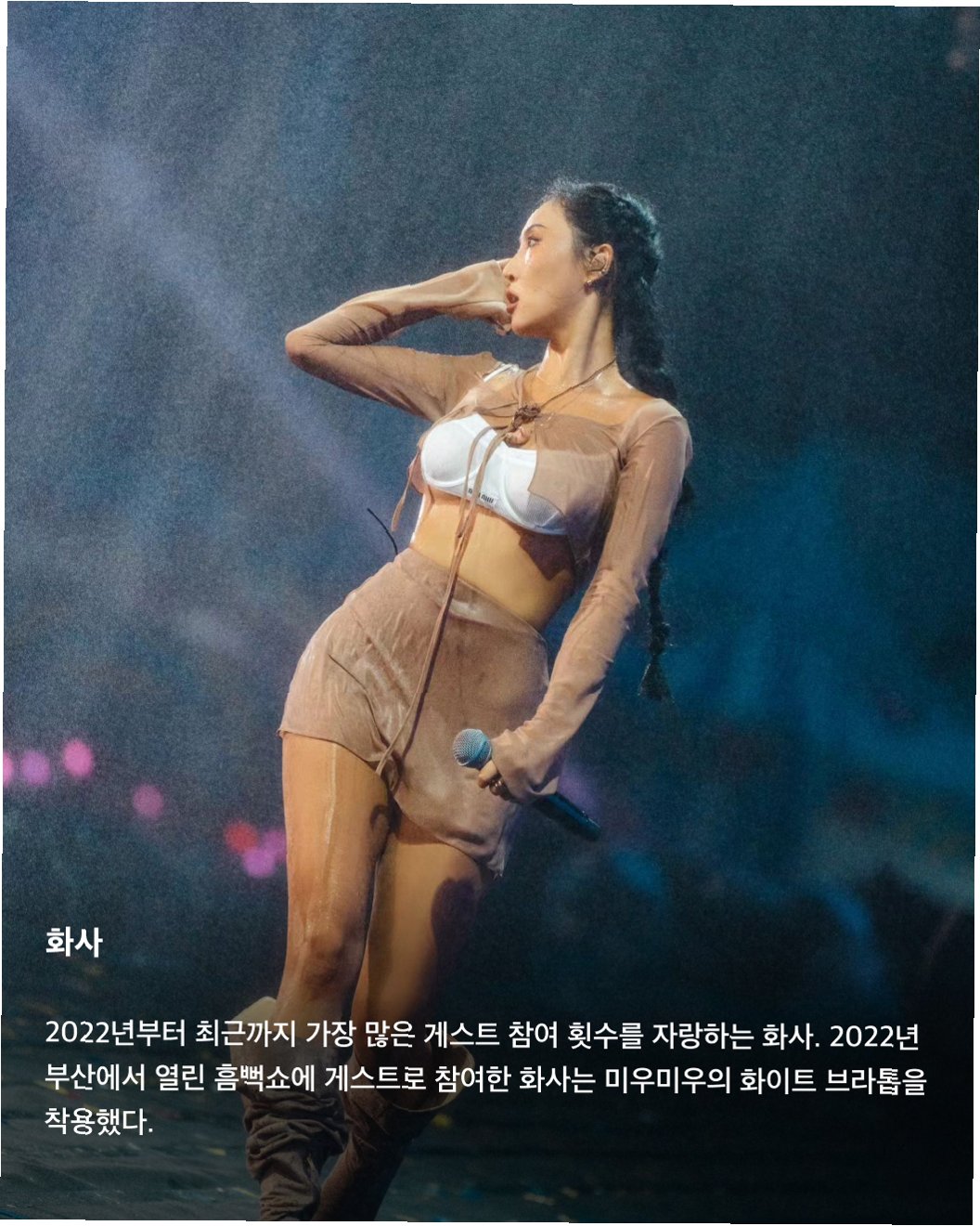 특히 드레스 위에 레이어드된 란제리 디테일은 화사 특유의 과감하면서도 세련된 패션 감각을 보여주는 포인트였습니다. 짧은 단발 헤어스타일과 내추럴한 메이크업은 고혹적인 분위기를 완성했습니다.