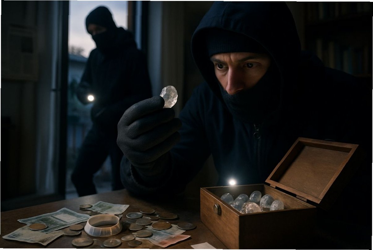 A.절도범들은 집 안을 뒤지던 중 발견한 작은 상자 안의 조약돌 같은 물체를 보고 희귀 보석으로 오인한 것으로 보입니다. 집주인이 보석이나 현금을 두지 않는다는 점을 고려할 때, 절도범들은 다른 가치 있는 물건을 찾으려다 이 상자를 발견한 것으로 추정됩니다.