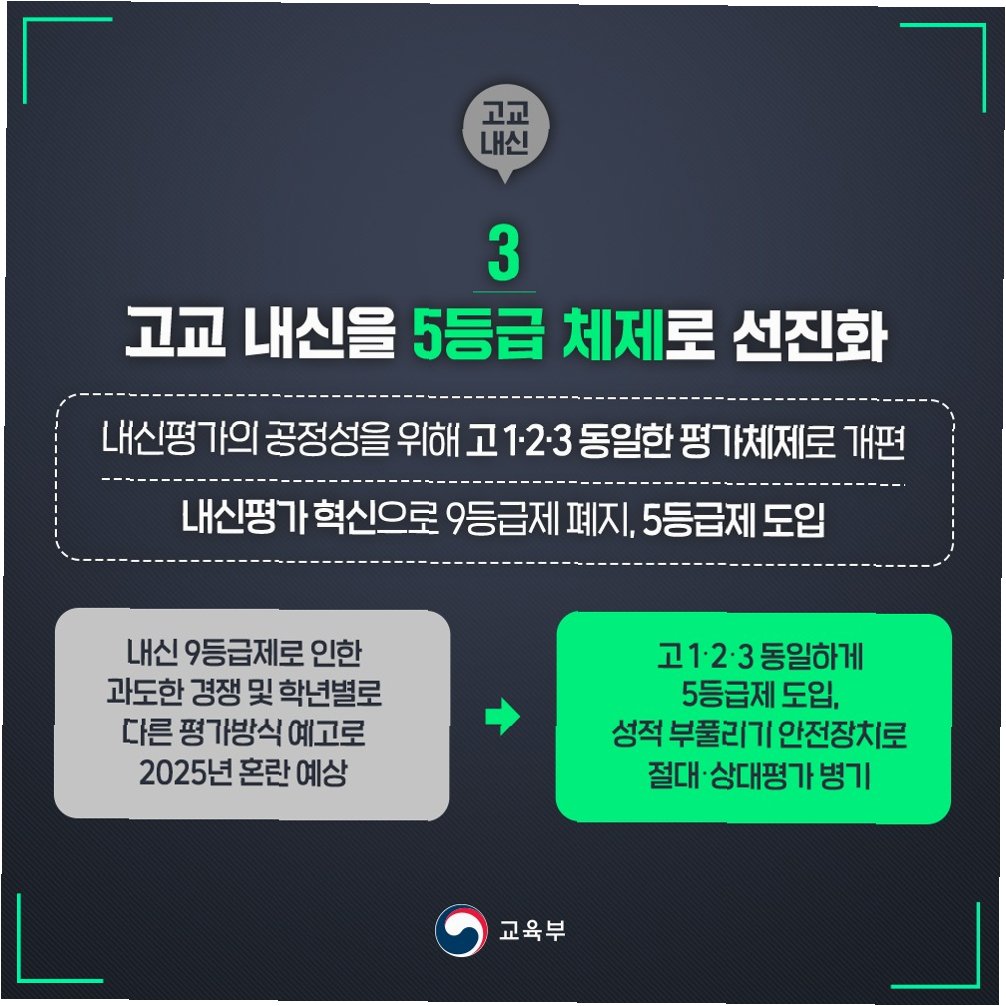 A.상대평가가 아닌 절대평가로 전환되면, 학생들은 상대적인 경쟁에서 벗어나 자신의 성장에 집중할 수 있게 된다. 구체적인 평가 방식은 추후 발표될 예정이다.