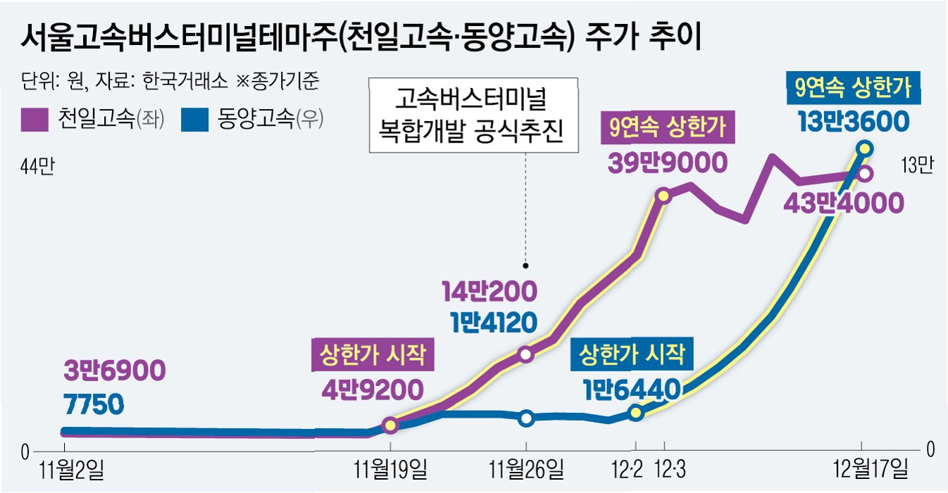 지난달 26일, 서울시의 서울고속버스터미널 부지 복합개발 관련 발표는 천일고속과 동양고속 주가에 불을 지폈습니다. 신세계센트럴과 서울고속버스터미널 측과의 사전 협상 착수 소식은 두 종목의 주가를 9거래일 연속 상한가로 이끌었죠. 이 기간 동안 천일고속과 동양고속의 주가 상승률은 무려 900%를 넘어섰습니다. 터미널 재개발을 통해 보유 지분 가치가 크게 부각될 수 있다는 기대감이 매수세를 이끌었지만, 과도한 기대는 결국 씁쓸한 결과를 낳았습니다.