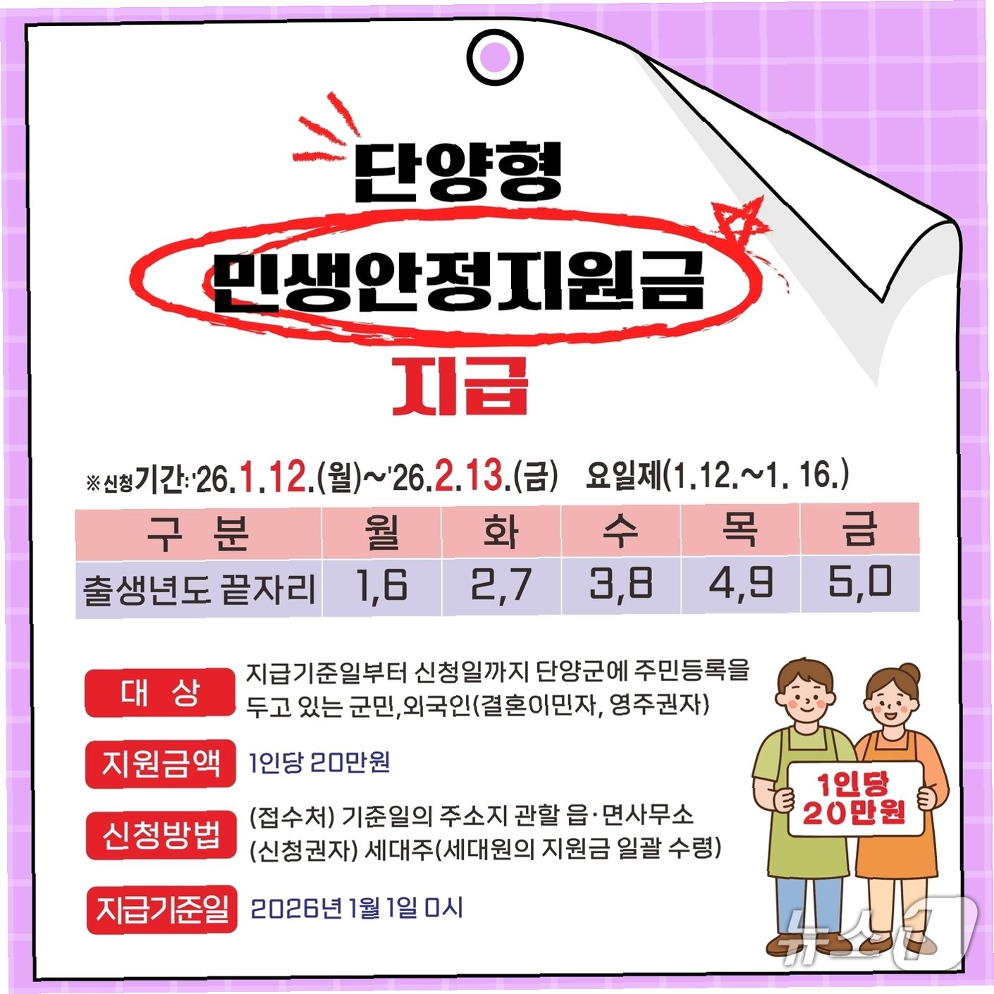 지원 대상 및 규모: 단양군에 거주하는 모든 군민에게 20만원 지급