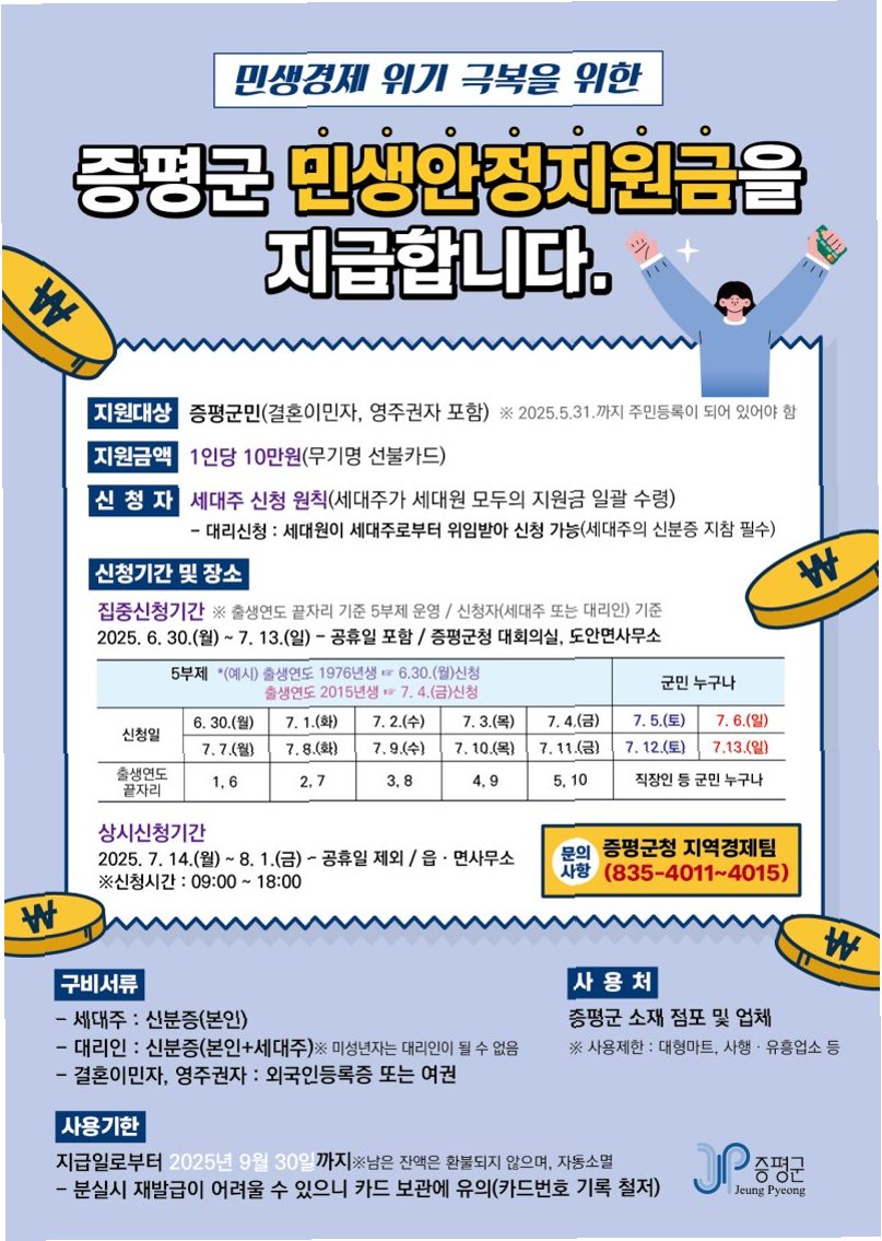 고물가 시대, 단양군은 군민들의 어려움을 공감하고 함께 극복해 나가기 위해 최선을 다하고 있습니다. 이번 민생안정지원금 지급은 그 노력의 일환이며, 앞으로도 군민들의 행복을 최우선으로 생각하며 다양한 지원 정책을 펼쳐나갈 것입니다. 단양군과 함께, 더 나은 내일을 만들어 갑시다.