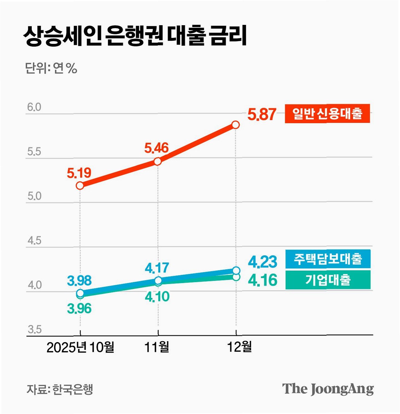 주담대·신용대출 금리, 10개월·3년 만에 최고치 기록