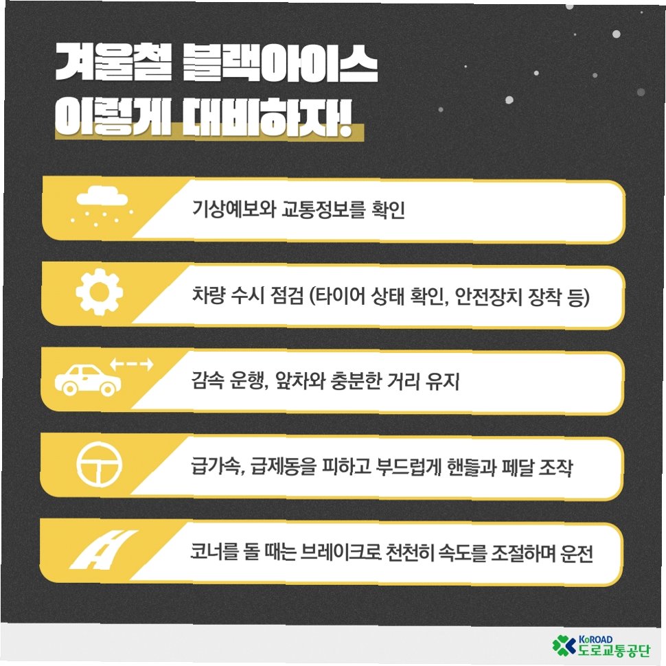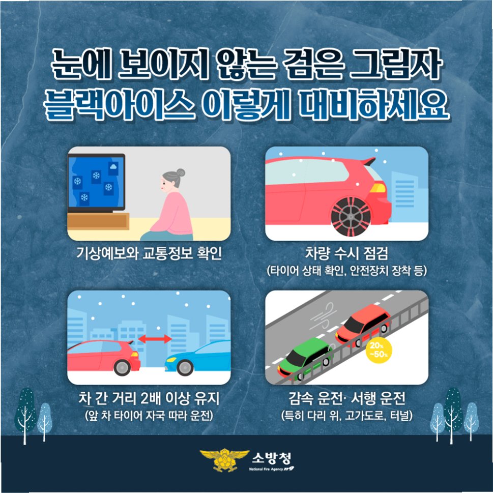 겨울철 안전 운전을 위해서는 다음과 같은 사항들을 반드시 숙지하고 실천해야 합니다. 먼저, 출발 전 타이어 공기압과 마모 상태를 점검하고, 블랙아이스 발생 가능성이 높은 지역에서는 감속 운전과 안전거리를 확보해야 합니다. 또한, 급제동, 급가속, 급회전은 피하고, 앞 유리창의 성에 제거를 철저히 해야 합니다. 특히, 블랙아이스는 육안으로 식별하기 어렵기 때문에, 평소보다 더욱 주의 깊게 운전해야 합니다. 마지막으로, 기상 상황을 수시로 확인하고, 위험한 상황에서는 운전을 자제하는 것이 좋습니다.