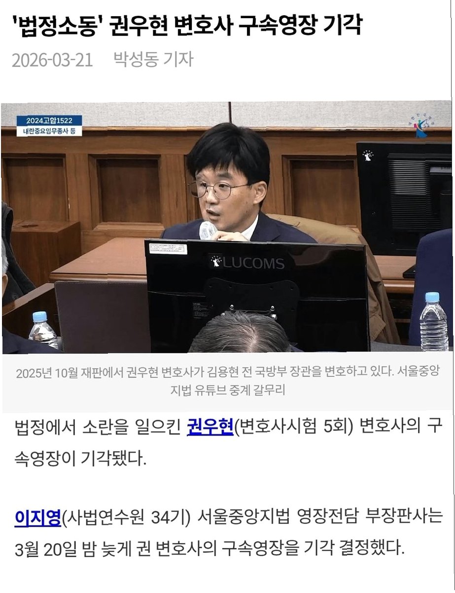 내란 재판 과정에서 법정 소란을 일으킨 혐의로 구속영장이 청구되었던 권우현 변호사에 대해 법원이 영장을 기각했습니다. 서울중앙지법 이지영 영장전담 부장판사는 피의자의 주거, 사회적 유대 관계, 증거 수집 정도, 진술 태도 등을 종합적으로 고려했을 때 현 단계에서 구속의 필요성이나 사유가 충분히 소명되지 않았다고 판단했습니다. 이는 법정 질서 문란 행위에 대한 사법부의 판단 기준을 보여주는 사례입니다.