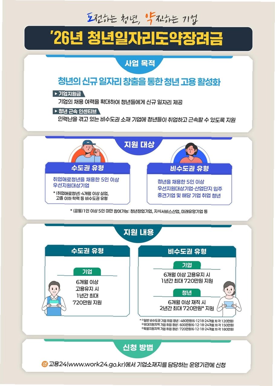 청년일자리도약장려금 사업은 기업의 채용 여력을 확대하고 청년의 취업을 직접적으로 지원하는 프로그램입니다. 특히 2026년부터는 비수도권 우대 원칙이 시범적으로 도입되어, 청년들의 지역 분산 효과를 높이는 데 중점을 둘 예정입니다. 수도권 유형의 경우, 4개월 이상 실업 상태인 취업애로청년을 채용한 5인 이상 우선지원대상기업이 지원 대상이며, 6개월 이상 고용을 유지하면 1년간 최대 720만원을 지원받게 됩니다. 이는 청년들이 안정적인 환경에서 직무 경험을 쌓고 경력을 개발할 수 있도록 돕는 중요한 기회가 될 것입니다.
