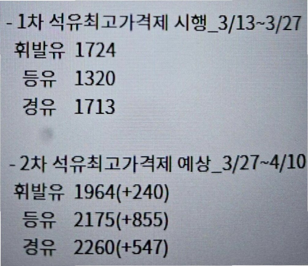 휘발유·경유 최고 가격이 리터당 210원씩 인상되었습니다. 정부는 유류세 인하 폭을 확대했지만, 국제 유가 상승으로 인한 부담을 완전히 상쇄하지는 못했습니다. 추가 유류세 인하 가능성도 있지만, 중동 사태 장기화로 물가 상승 압력은 지속될 것으로 보입니다.