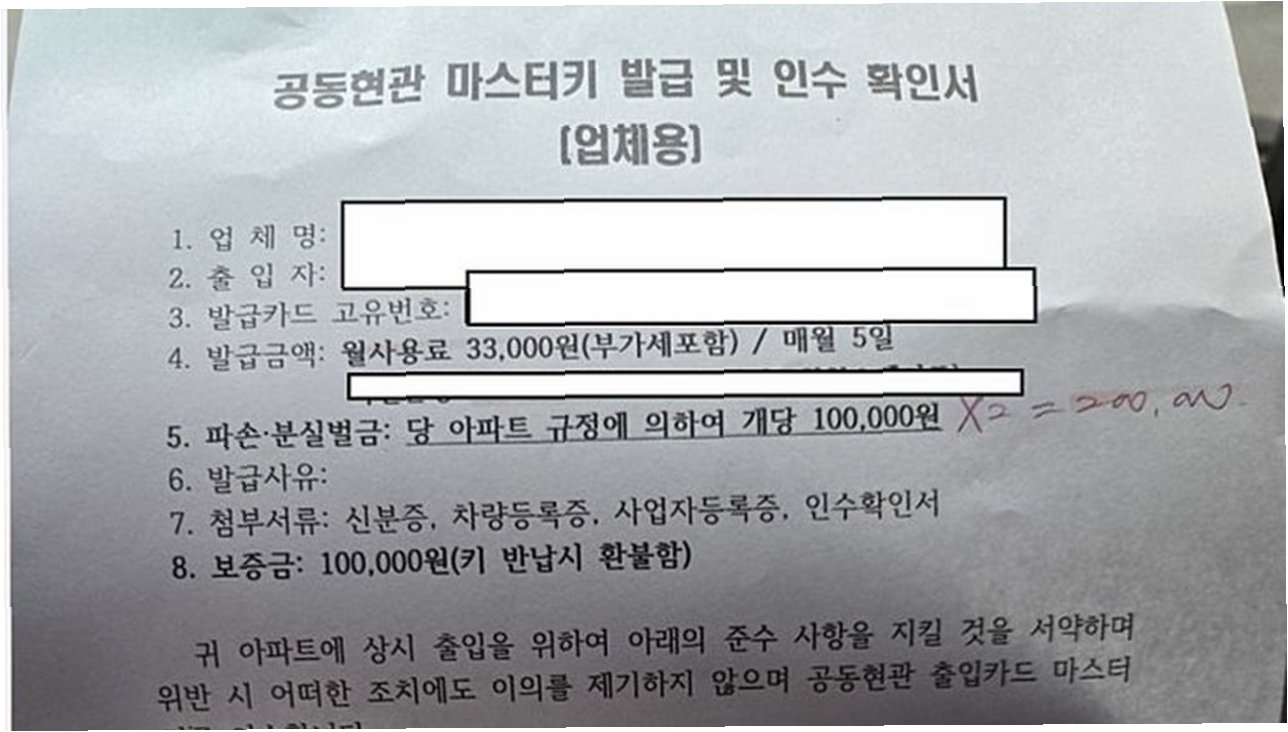 글에 첨부된 '공동현관 마스터키 발급 및 인수 확인서'에는 택배회사 및 택배기사가 아파트에 상시 출입하기 위해 마스터키를 발급받고 보증금 10만원과 월 사용료 3만 3000원을 납부했다는 내용이 담겼다.