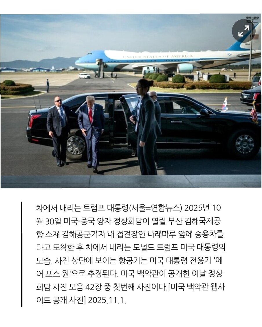A.김해공항 사진은 트럼프 대통령과 시진핑 주석의 회담을 연상시키며, 미국의 대중국 및 국제 외교 전략과 관련된 메시지를 전달하기 위한 의도로 해석됩니다.